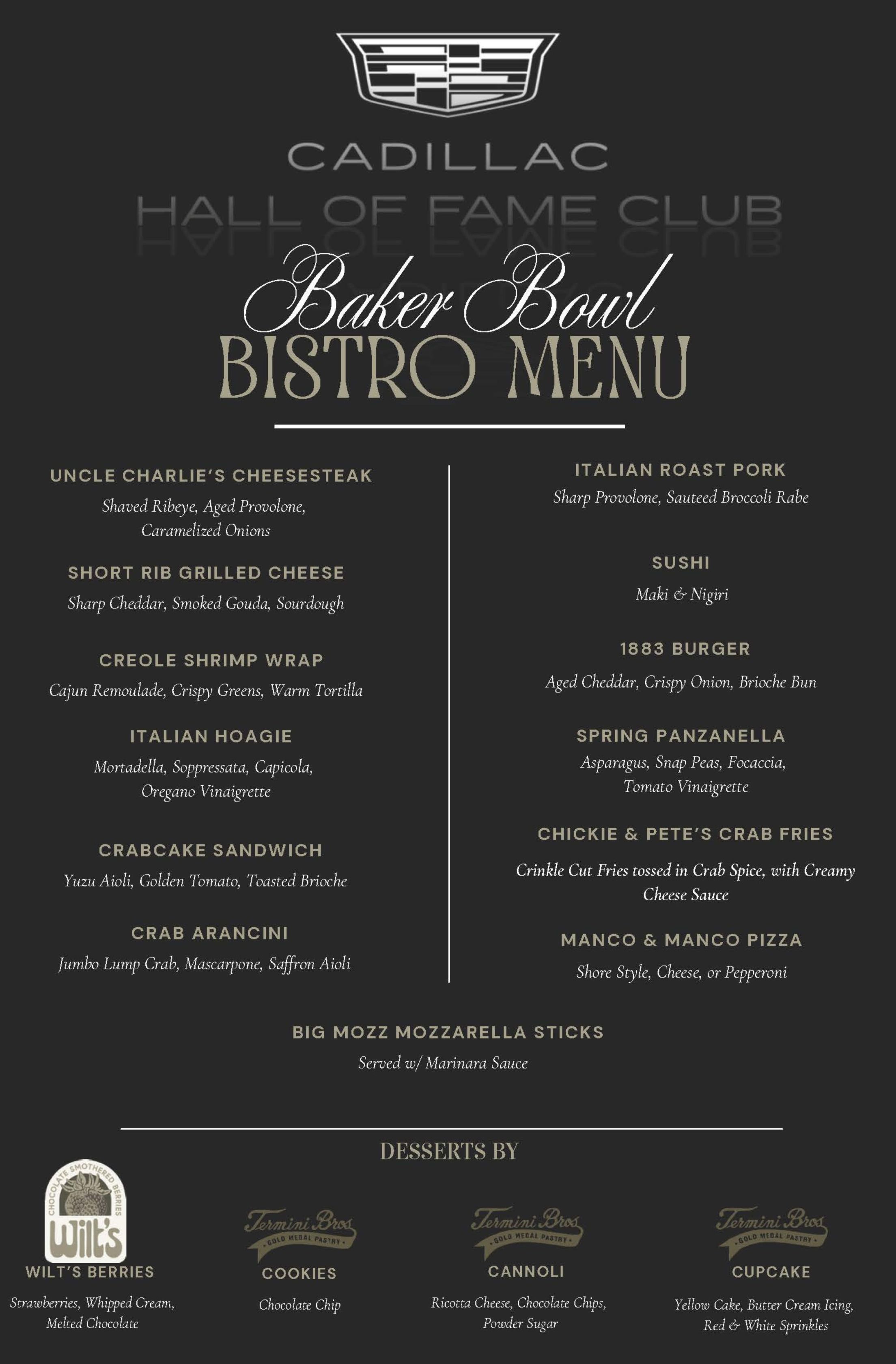 Visit the Baker Bowl (Section 214) & Connie Mack’s (Section 230) bistros in the Cadillac Hall of Fame Club for upscaling dining and beverage options. Additionally, each homestand the bistro stands will feature a specialty item in conjunction with a local culinary partner.