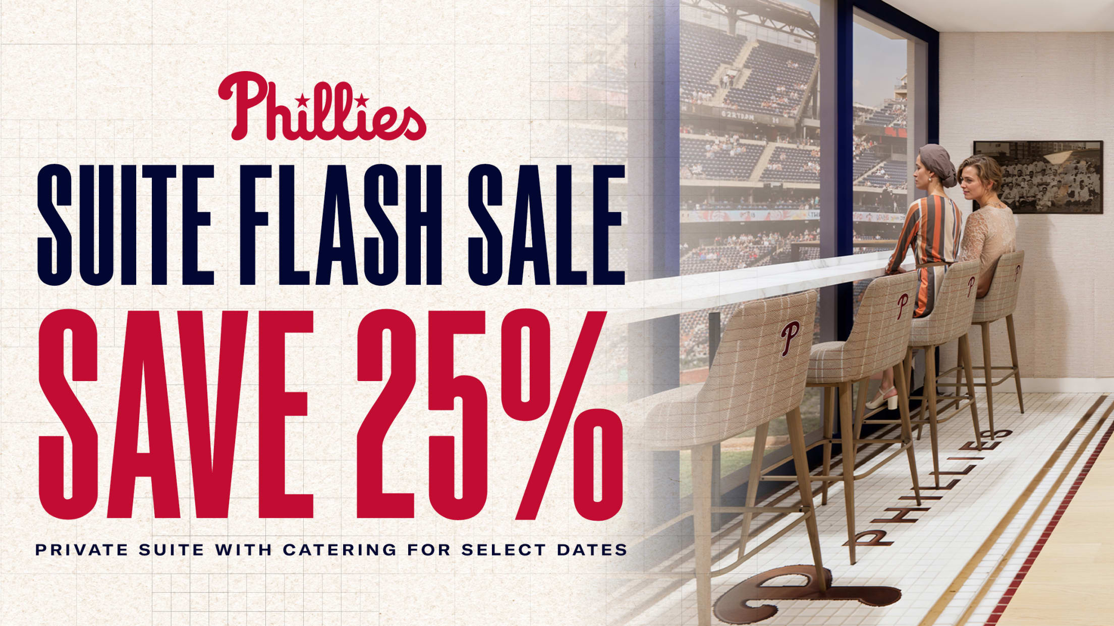 For this flash sale and based on availability, you will be assigned Corporate Party Suite 4-5 or 66-69 or Cadillac Hall of Fame Club Suite 71, 72, 75 at the Phillies discretion. Applicable fees are included in the package price.