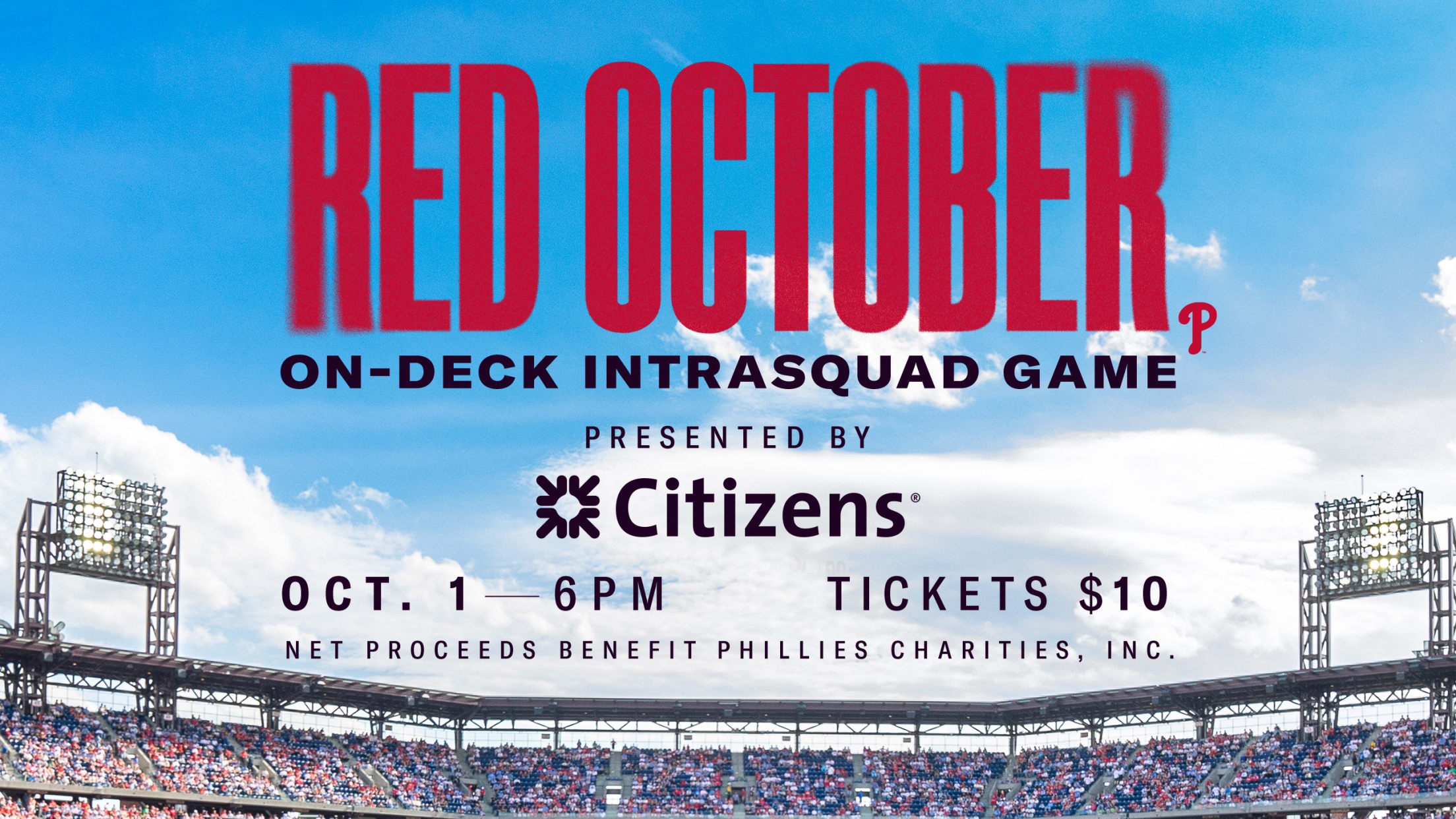 It’s time to get ready for Red October! On Wednesday, October 1, fans are invited to attend the Phillies Red October On-Deck Intrasquad Game presented by Citizens at 6 p.m. at Citizens Bank Park. Net proceeds from this event will benefit Phillies Charities Inc.