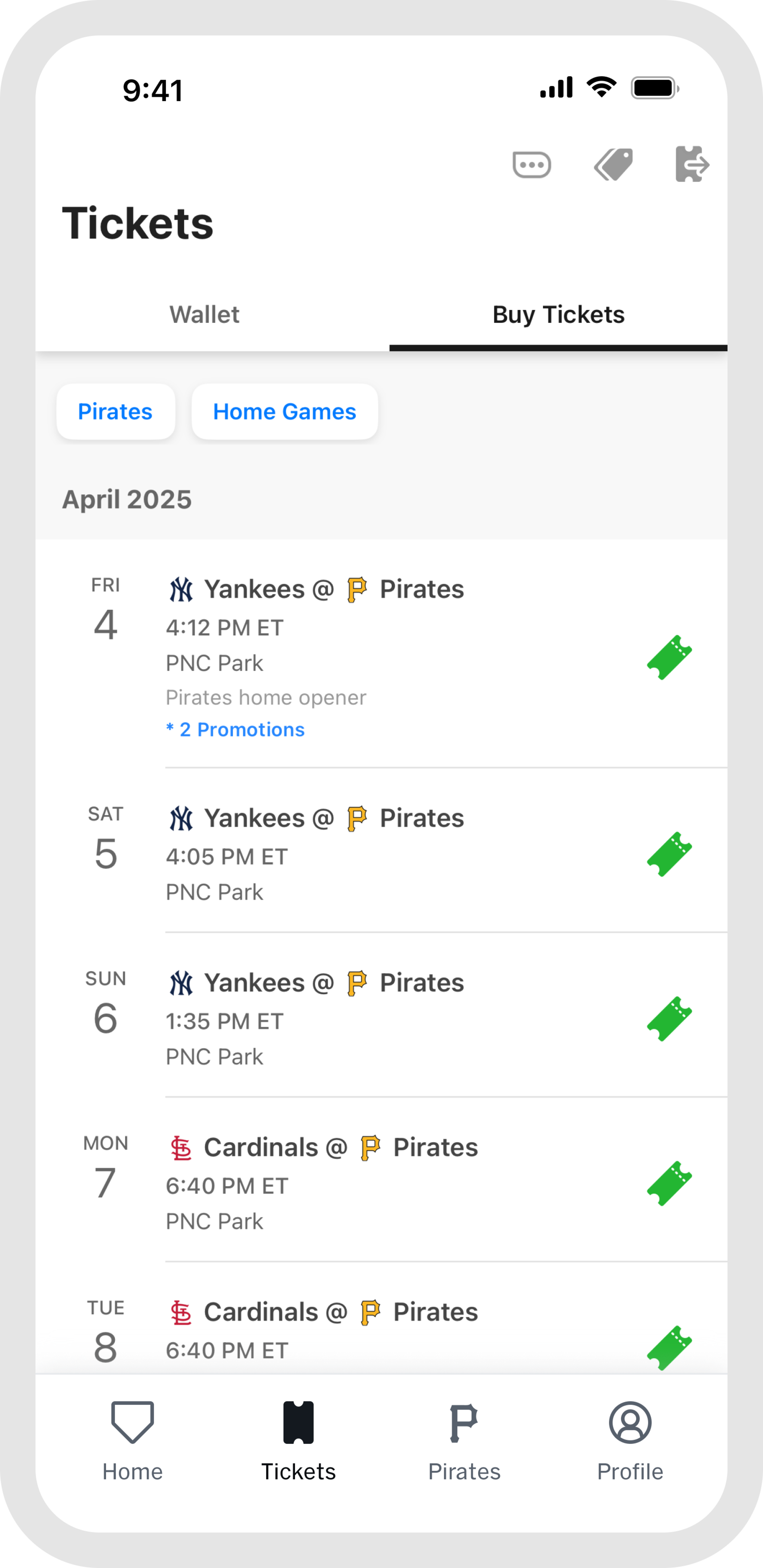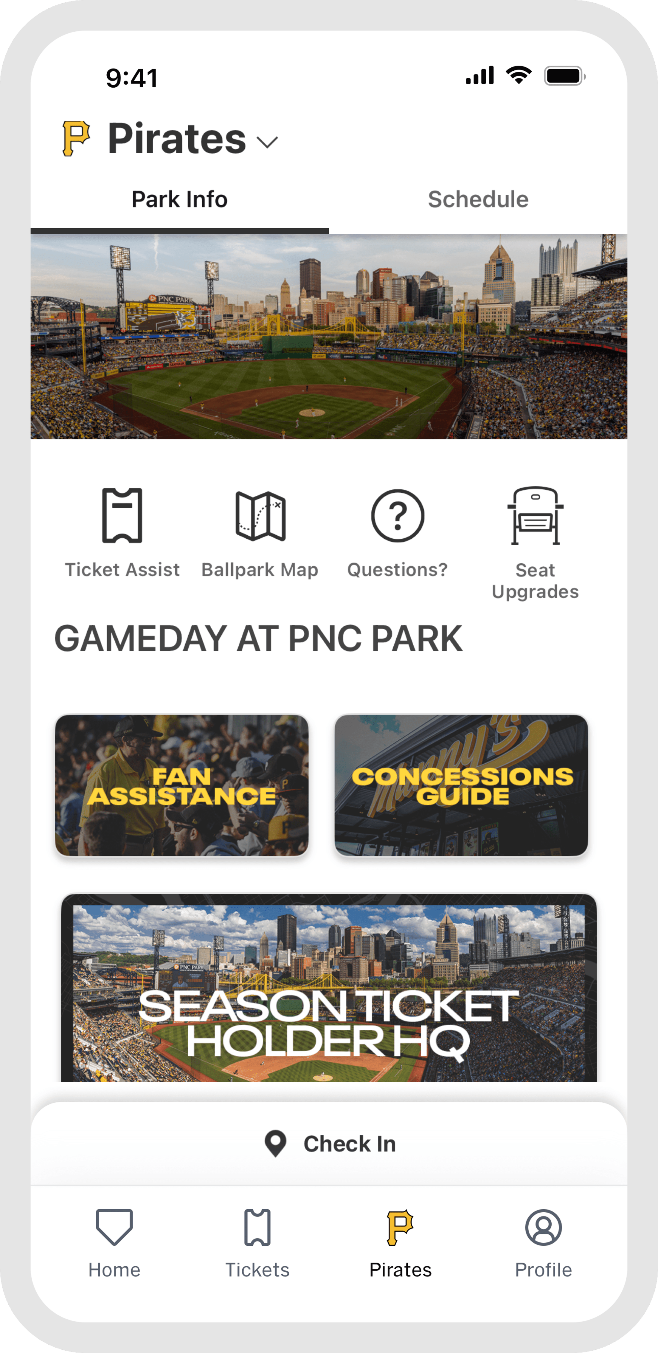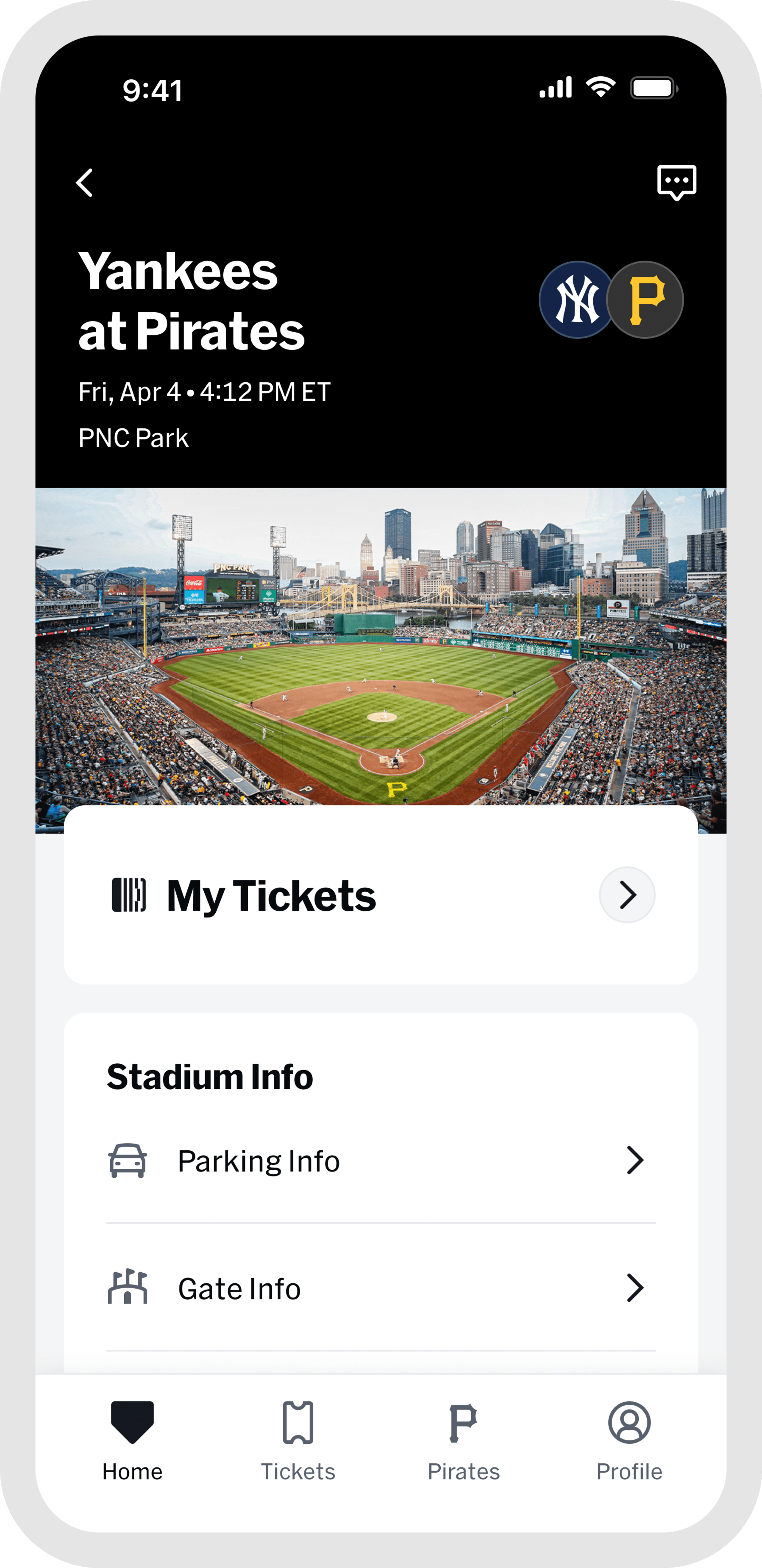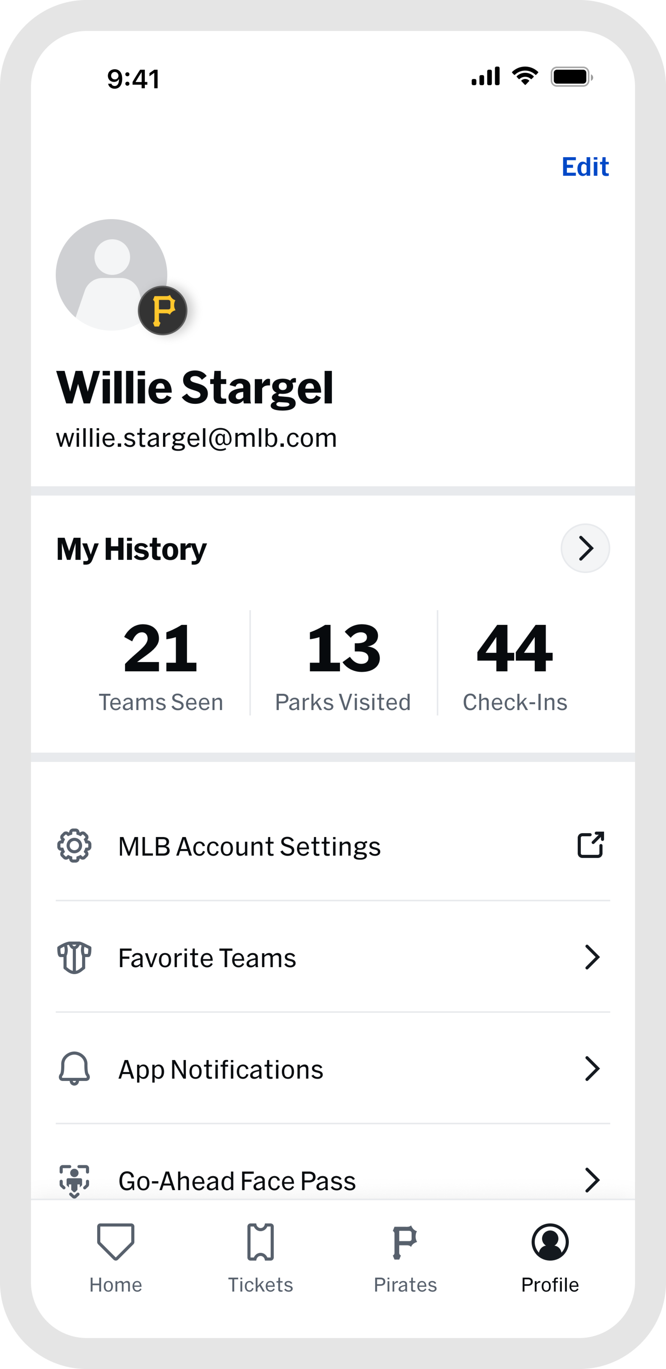 Once you arrive, the "Home" and "Pirates" tabs become your go-to resource for venue details and features that enhance your gameday experience. Capture and preserve your ballpark memories by tapping "My History" within the "Profile" tab.