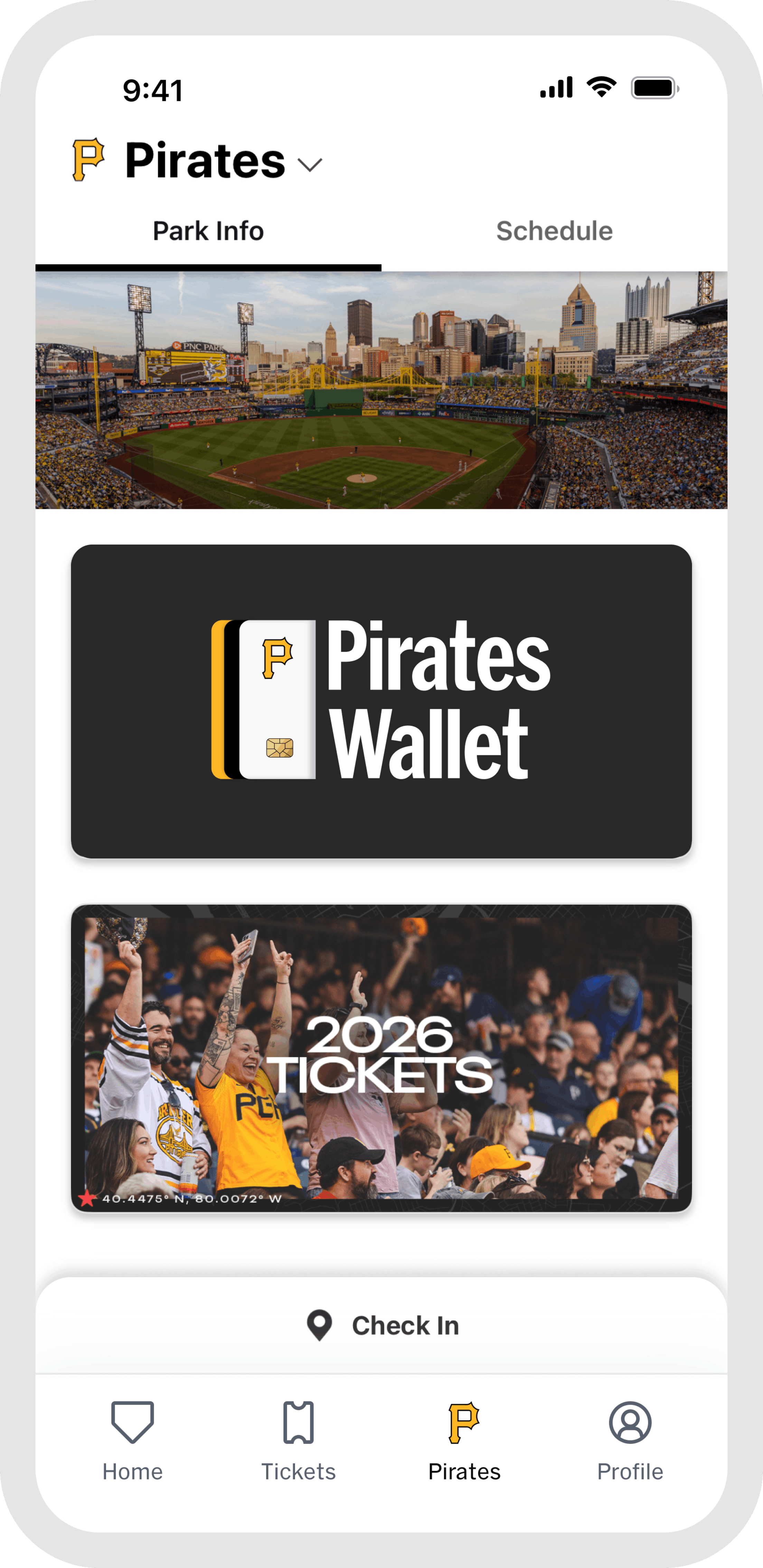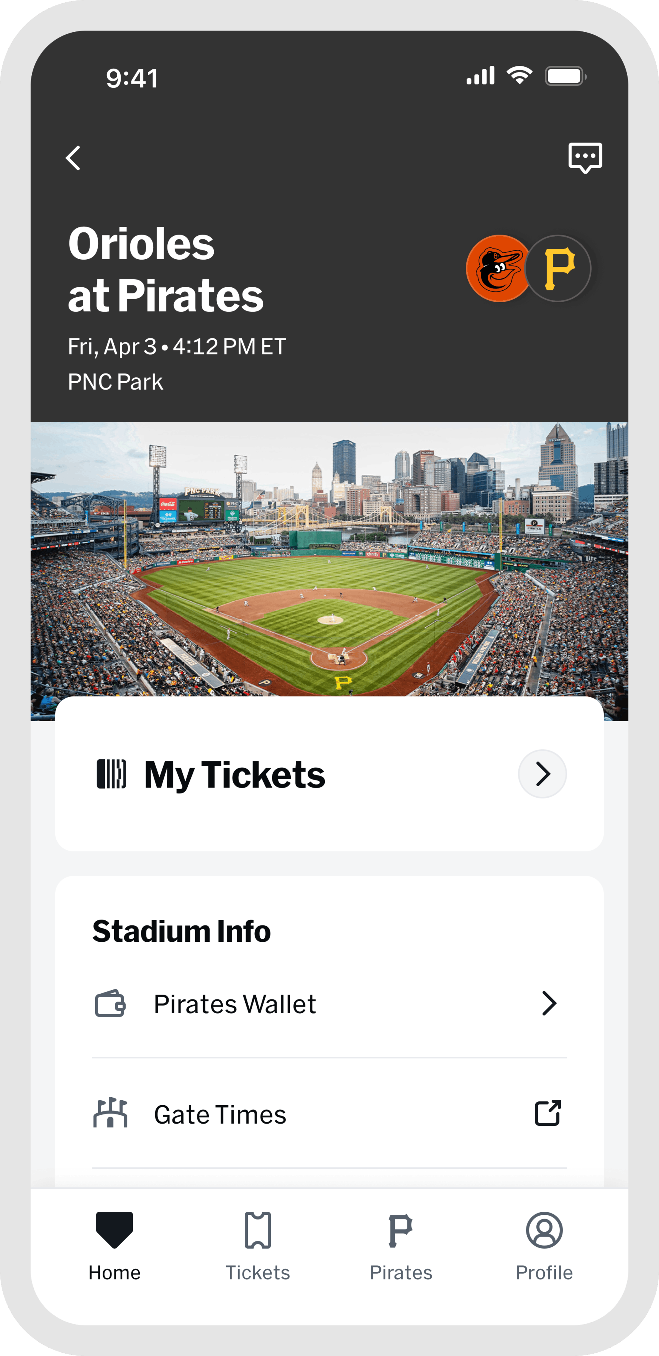 Once you are at the game, the "Home" and "Pirates" tabs are your go-to for everything venue-related. Browse stadium maps, jump into interactive games, find concession info, and access in-game features all designed to make your experience better from first pitch to final out. When the game wraps up, head to "My History" in the "Profile" tab to revisit every game you have attended, all in one place.