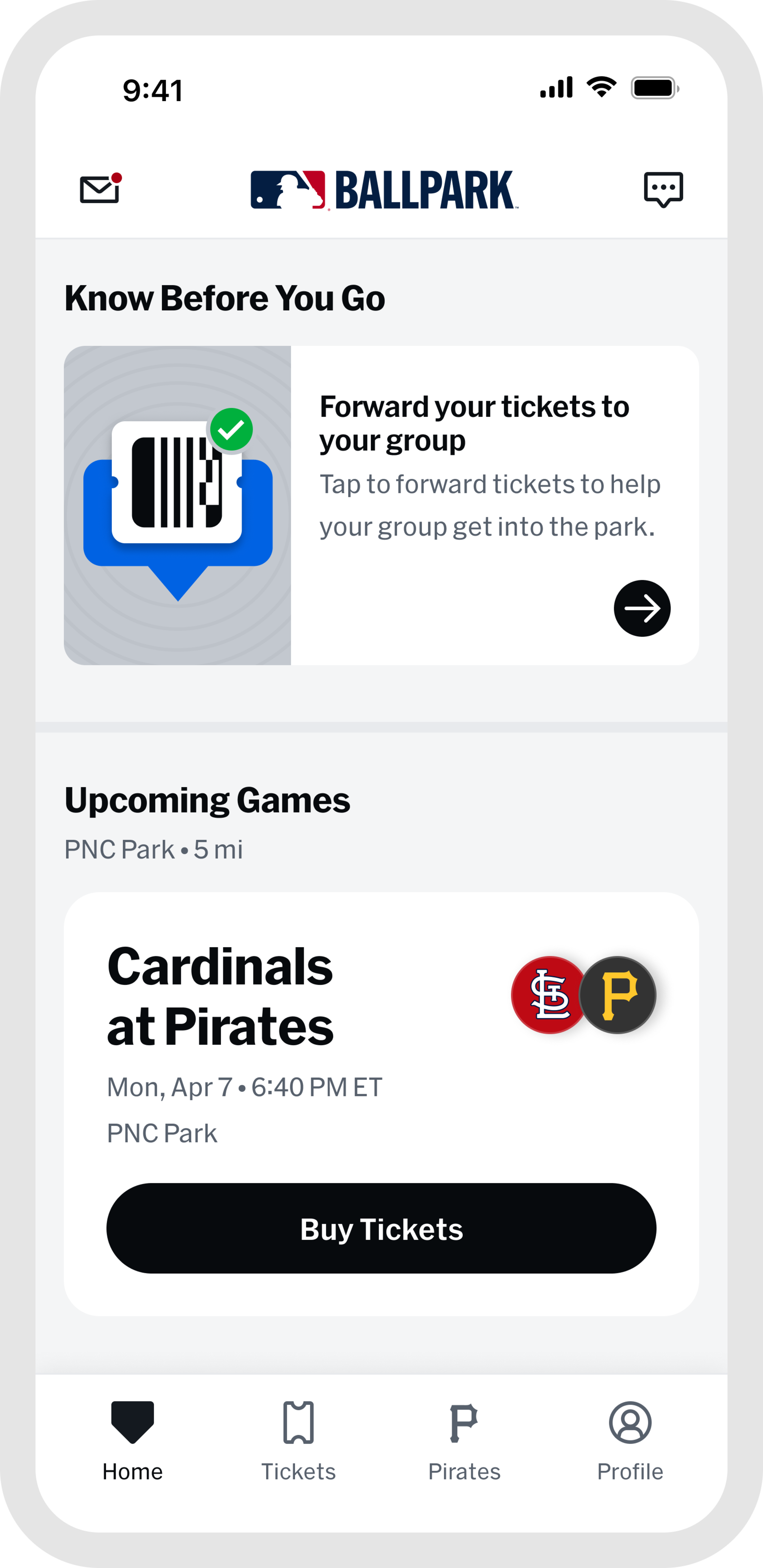 Forward a ticket by navigating to "Wallet" within the "Tickets" tab and selecting the game you're attending. From the list of tickets for that game, tap the forward button and choose which tickets you'd like to send.