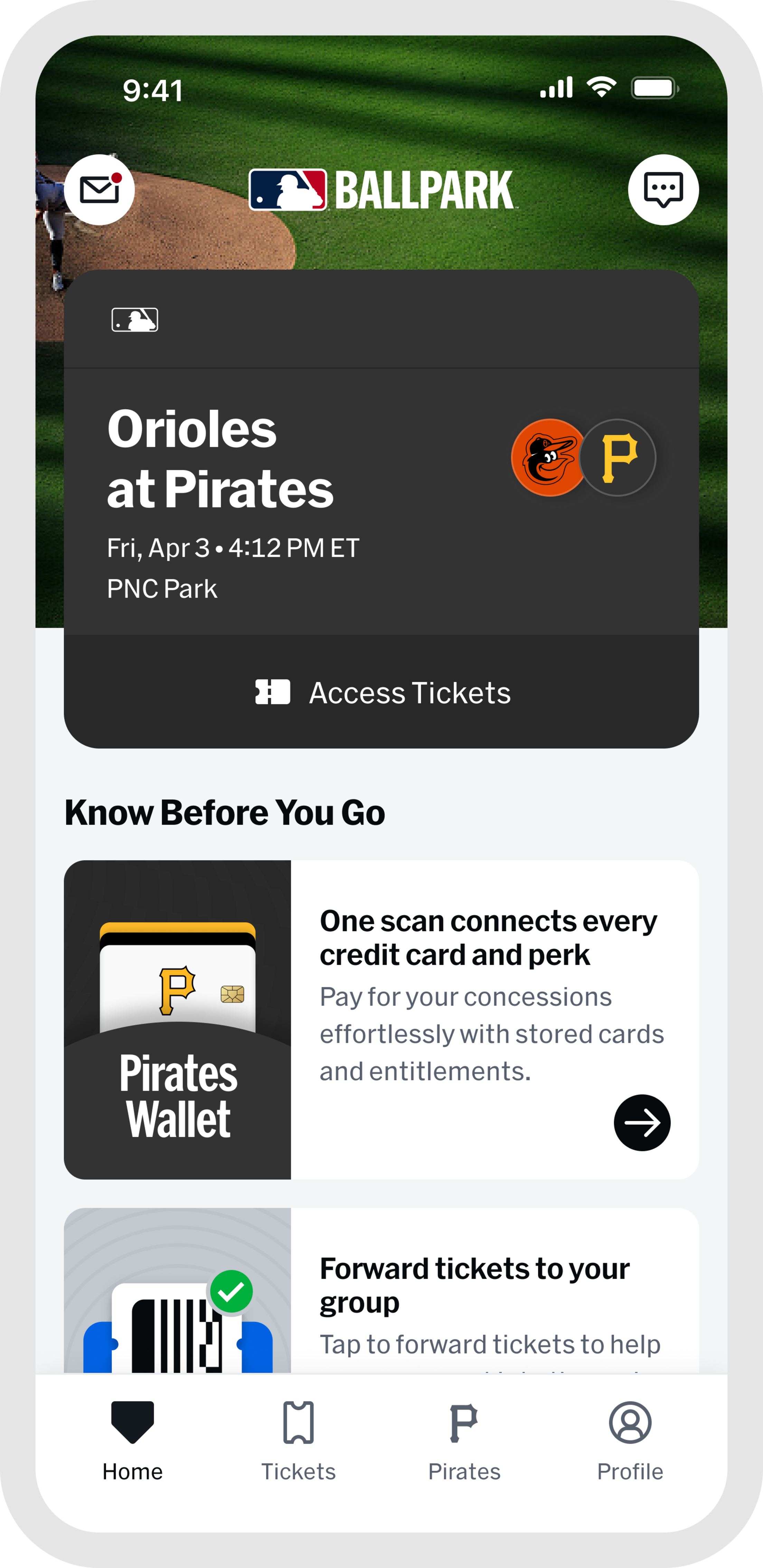 Head to the "Tickets" tab, tap "Wallet," and select the game you are attending. From your ticket list, tap the forward button and choose which tickets to send.