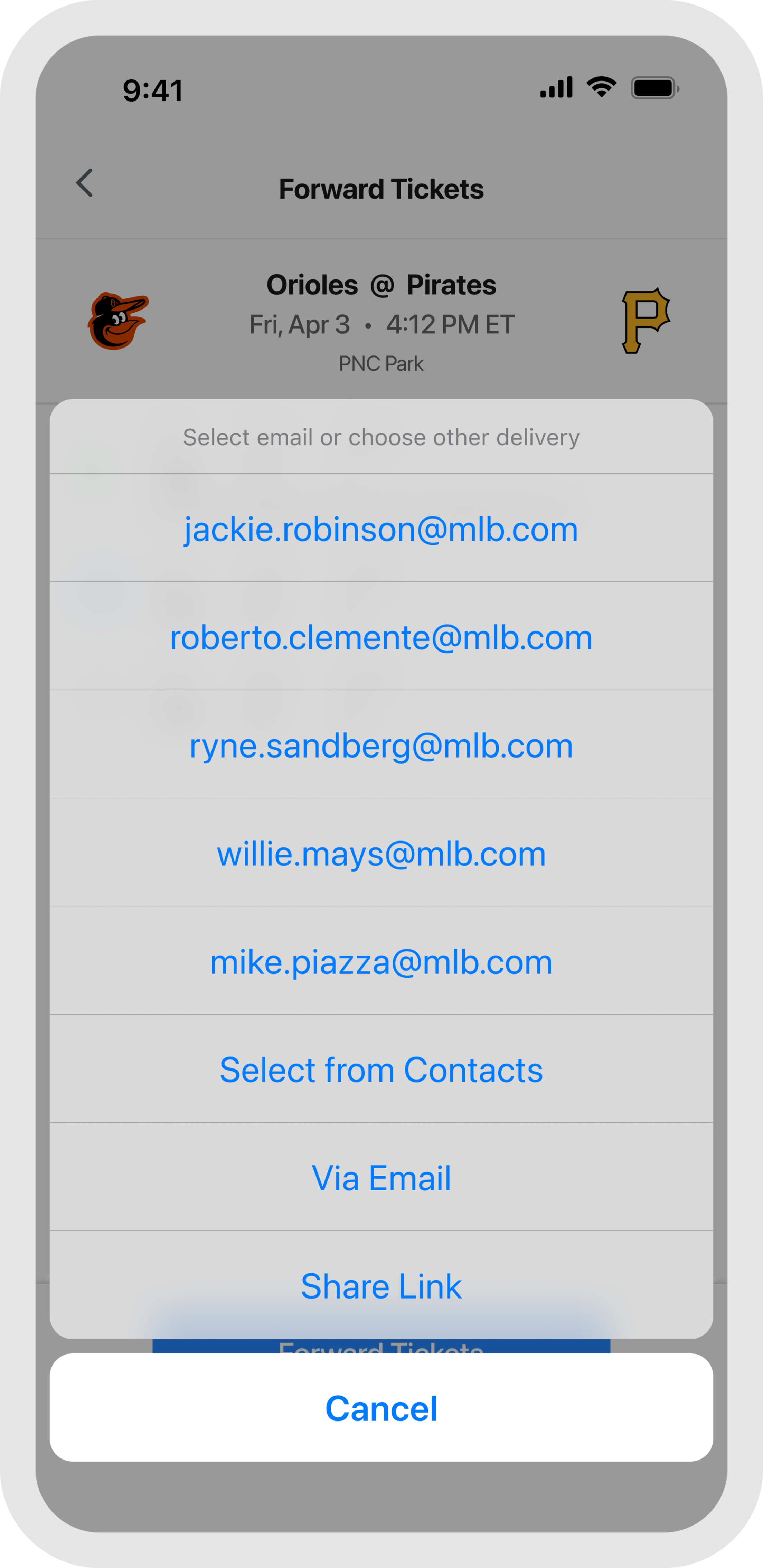 No email address? Use the share link option and send tickets directly through text. Having your number saved in their contacts helps ensure the message does not get filtered as unknown. Once they tap the link, the tickets will be waiting in their MLB Ballpark app account.