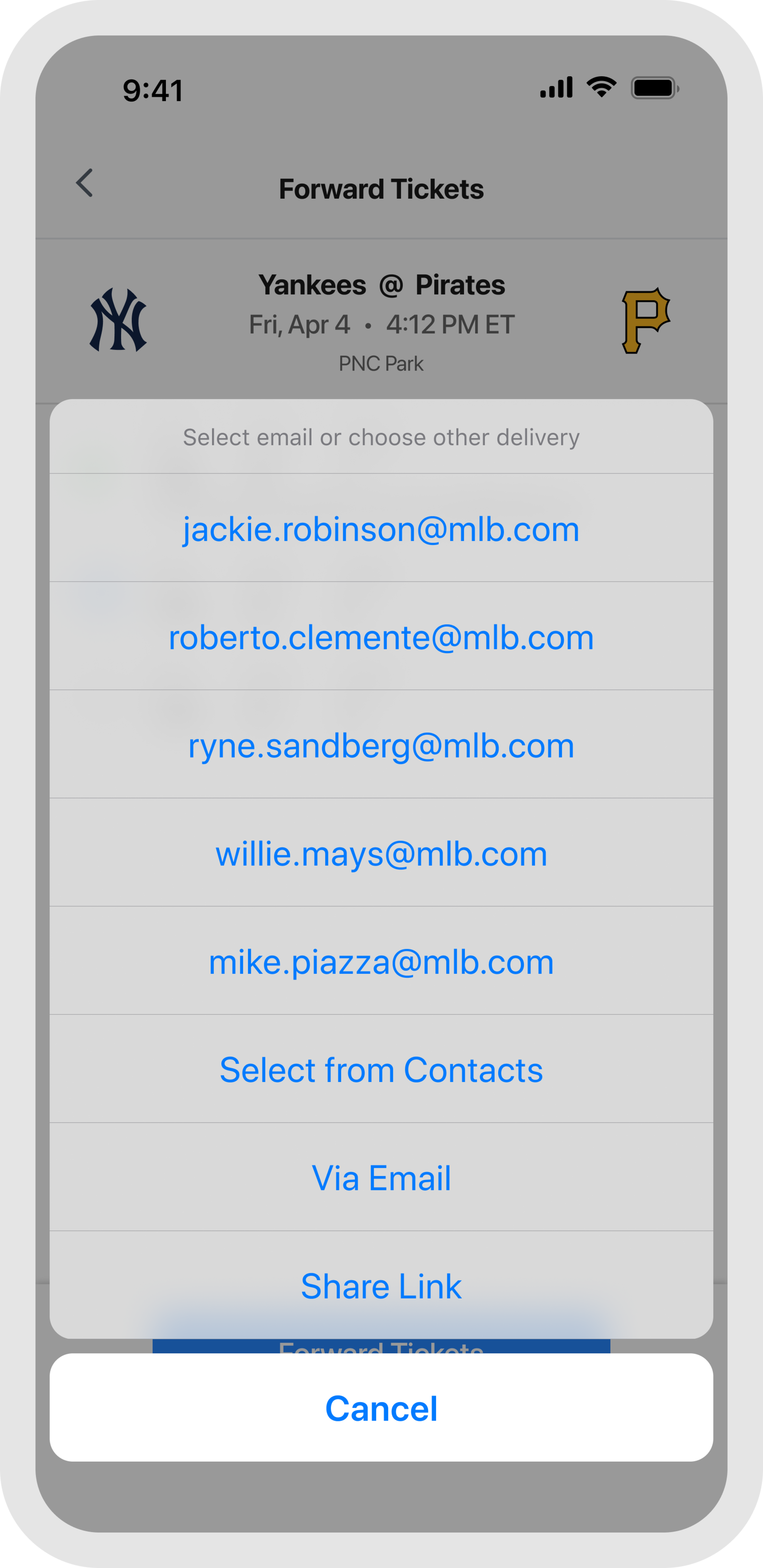 If you choose to forward via email, you can enter an email address manually, select a contact from your device's address book, or quickly send tickets to friends you've recently forwarded to by tapping on their email. Your friend will receive a notification letting them know you've sent them mobile tickets.