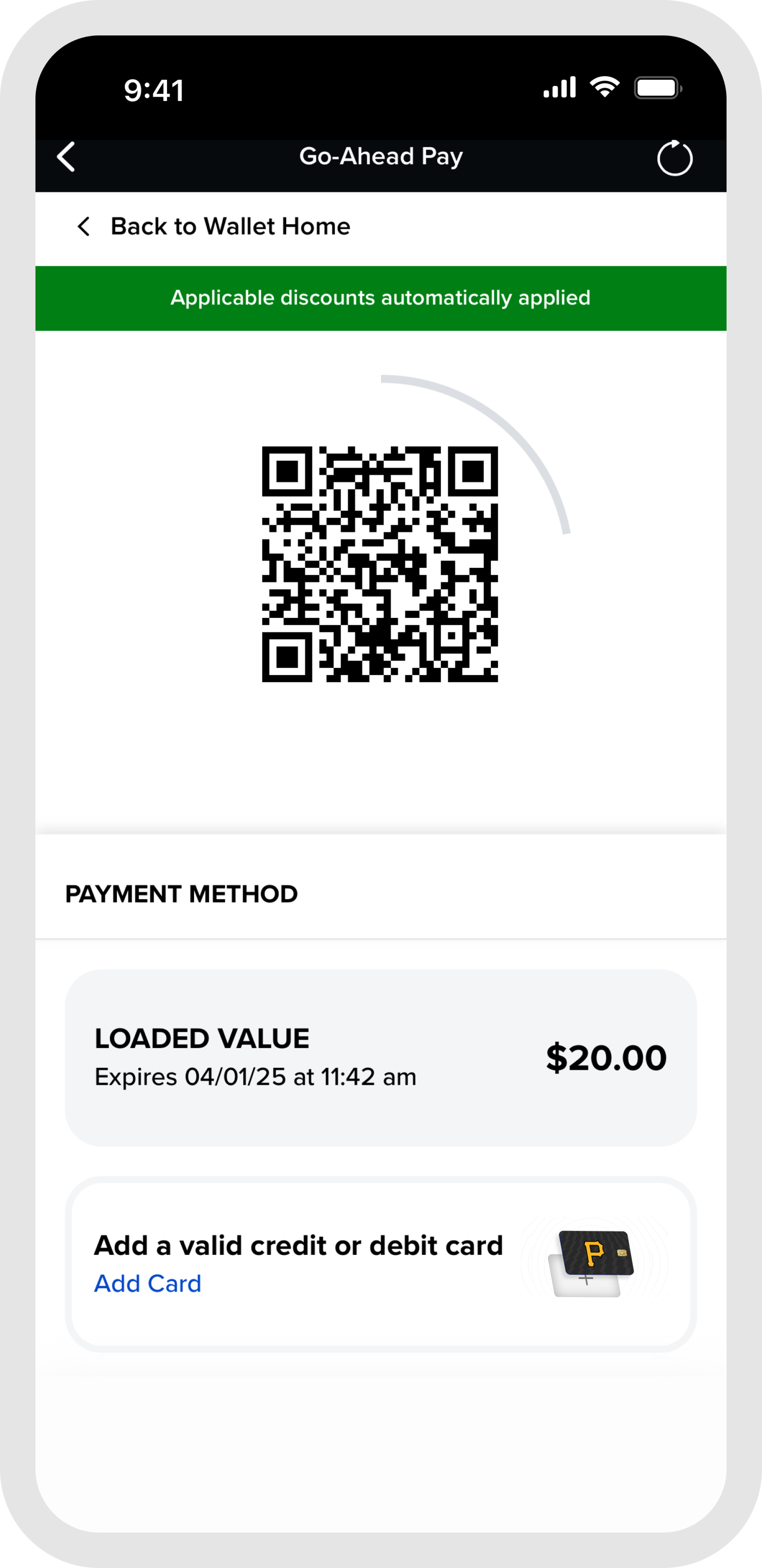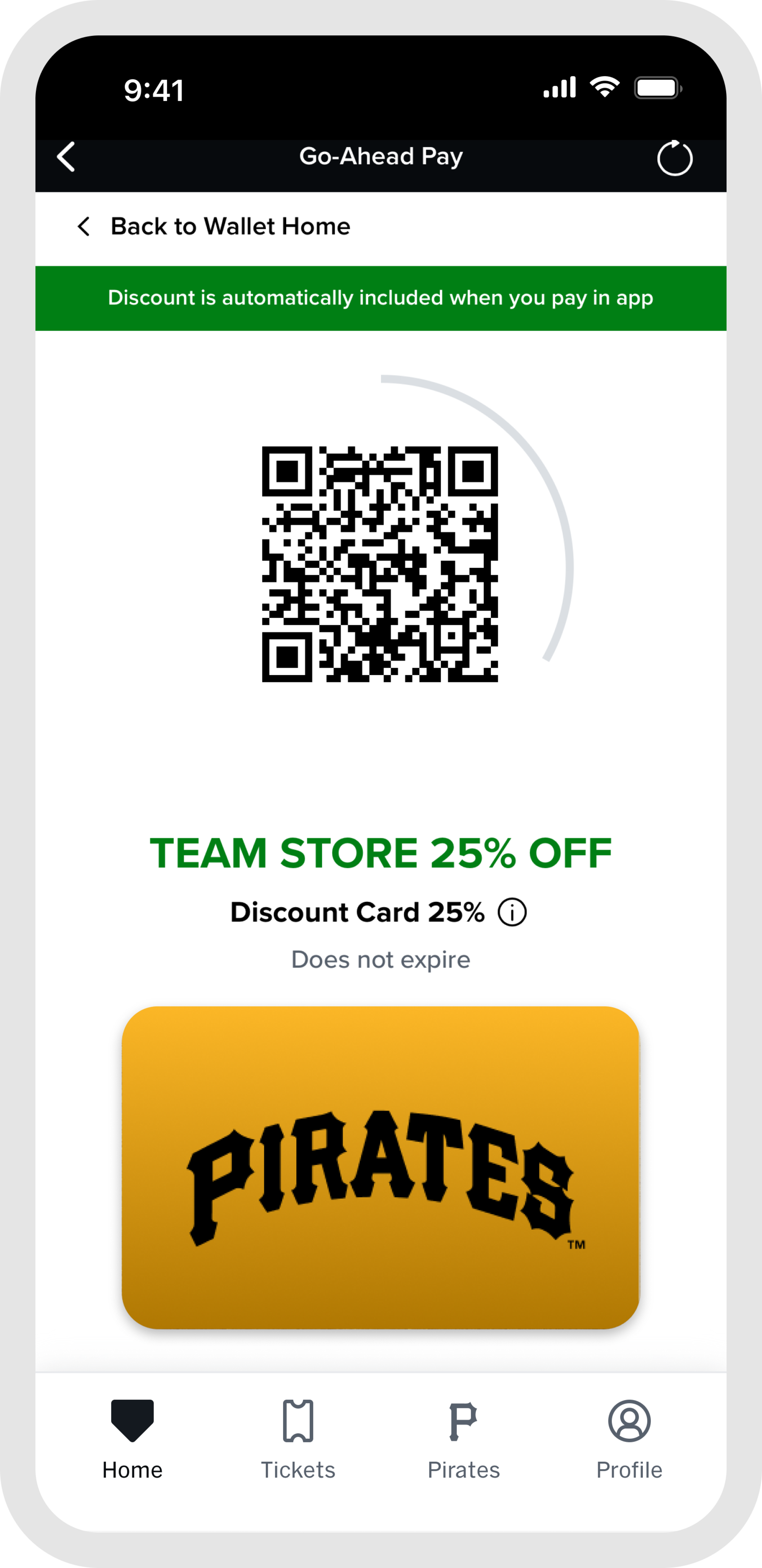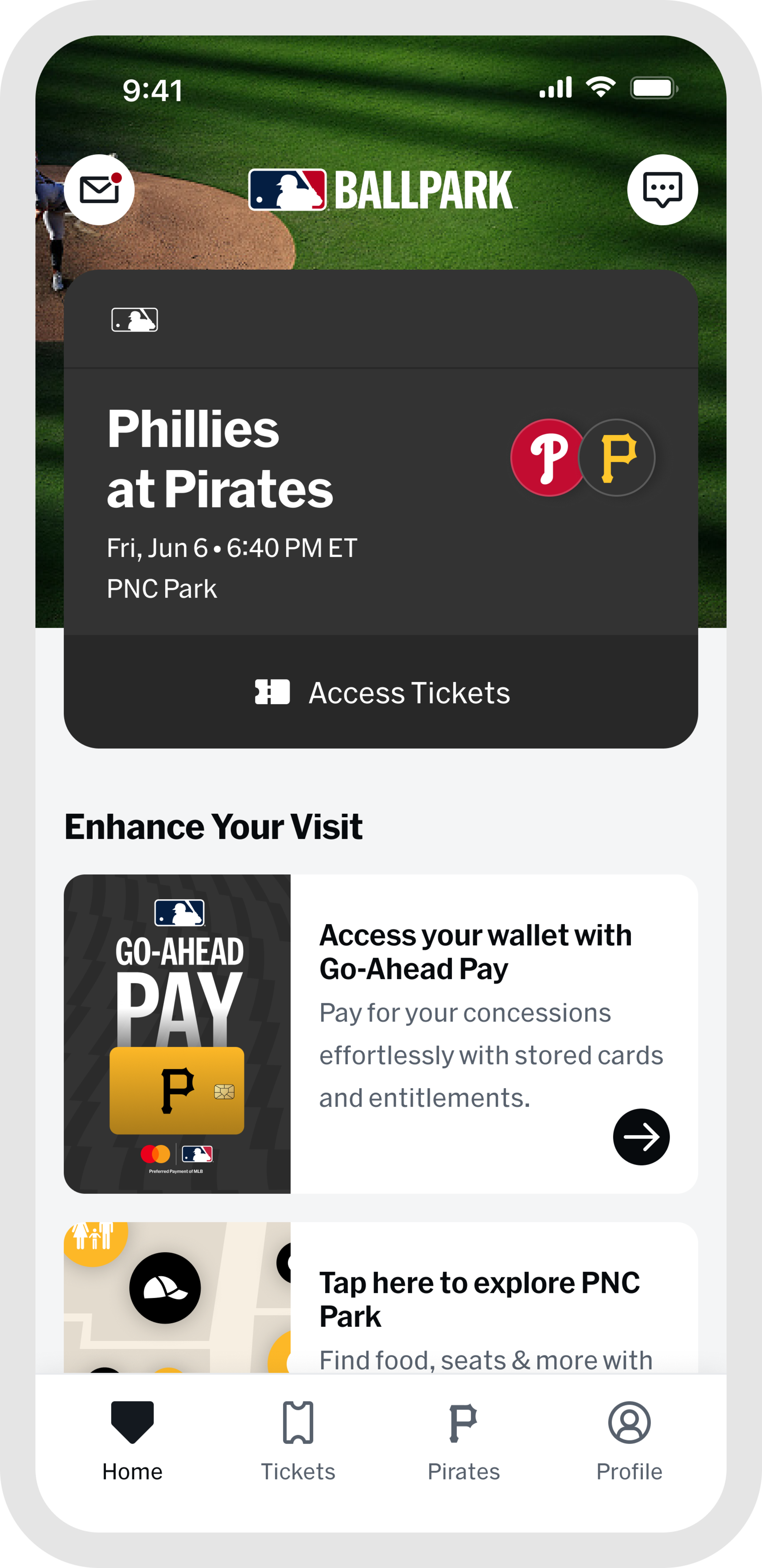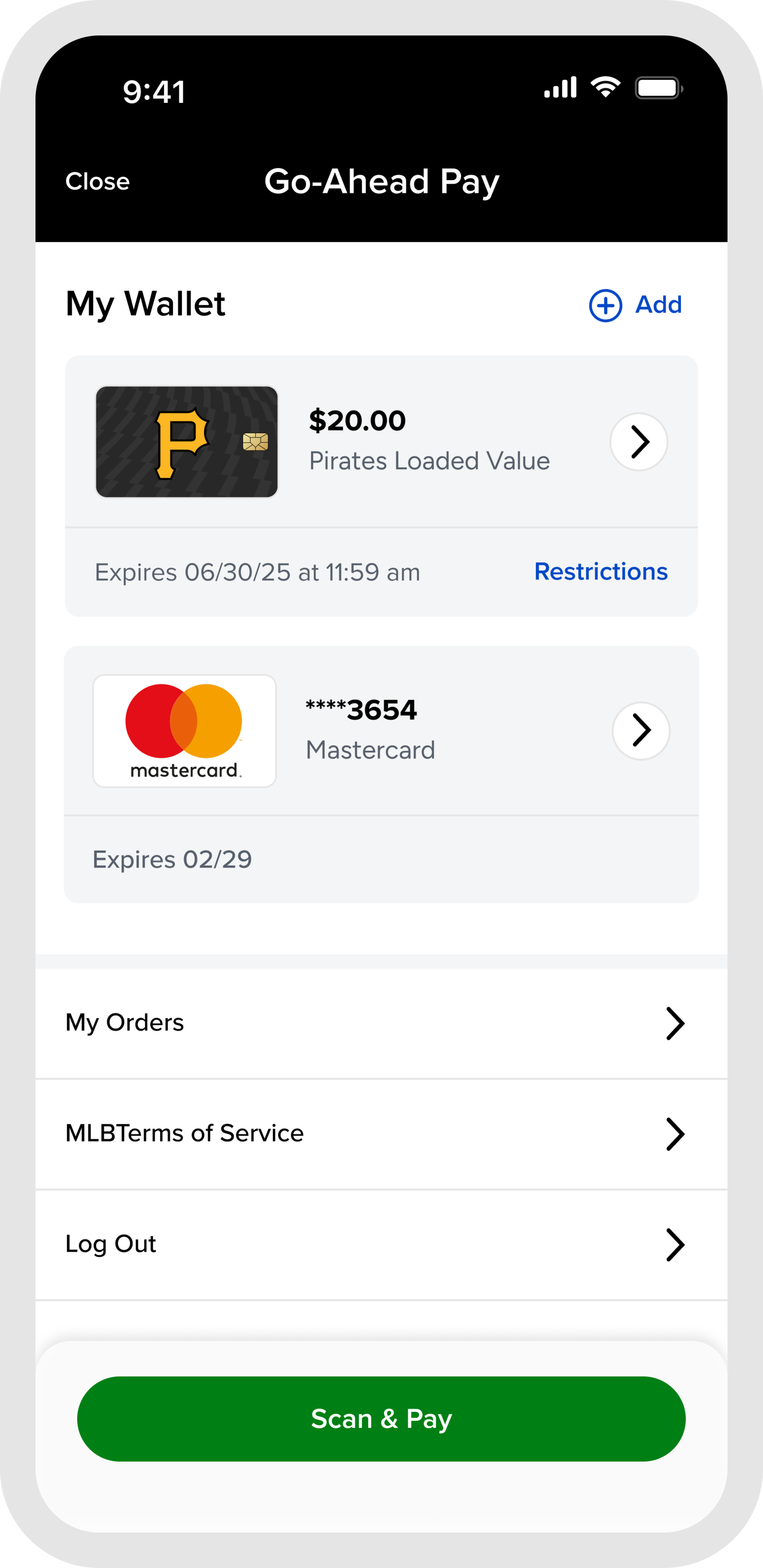 Go-Ahead Pay provides a seamless way for fans to manage their ticket entitlements and concession credit in one centralized wallet experience. Go-Ahead Pay is available to fans using the MLB Ballpark app at PNC Park concession and retail locations, some restrictions may apply based on the credit or discount. Please see Terms of Use and Privacy Policy for more information.