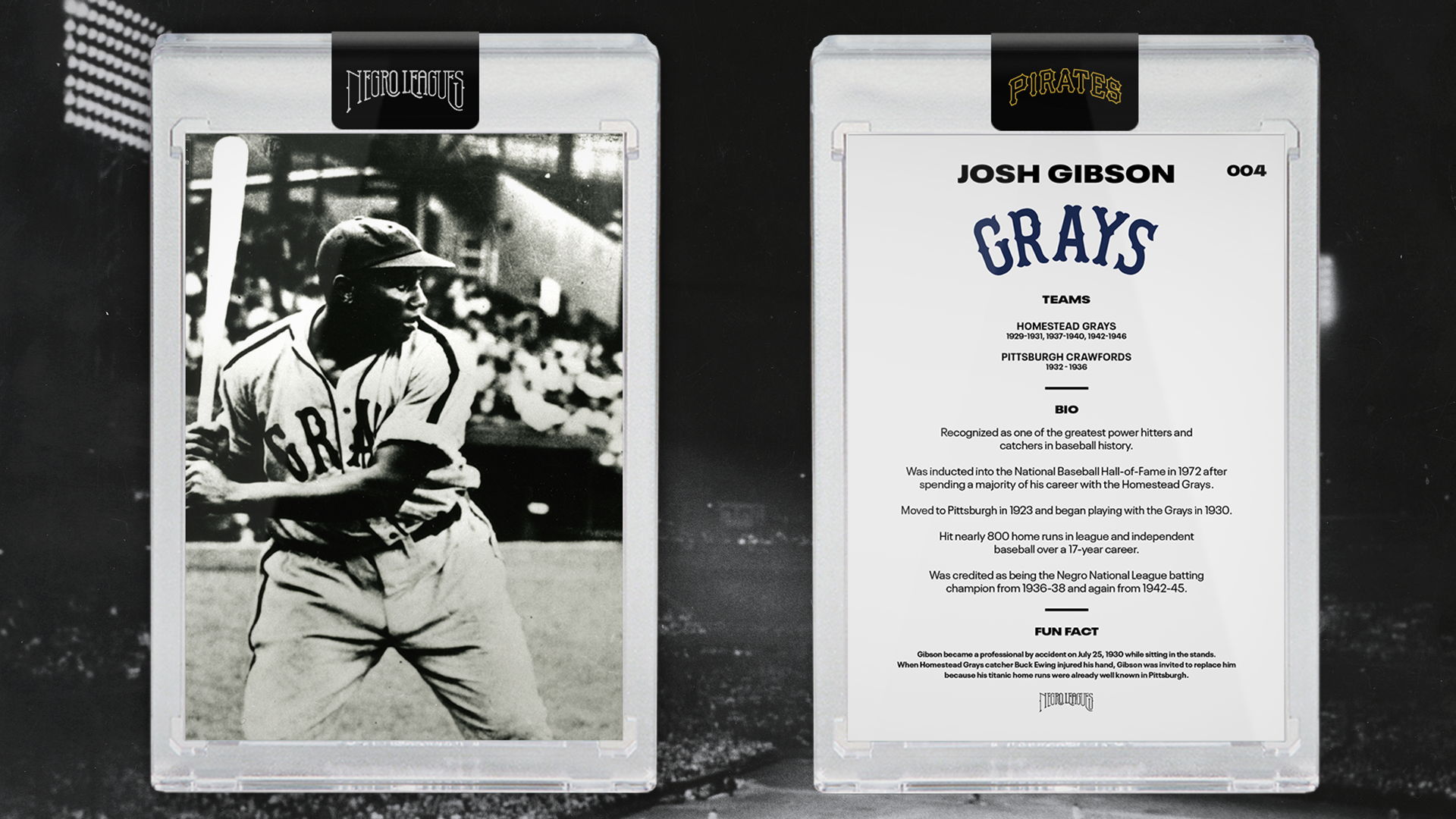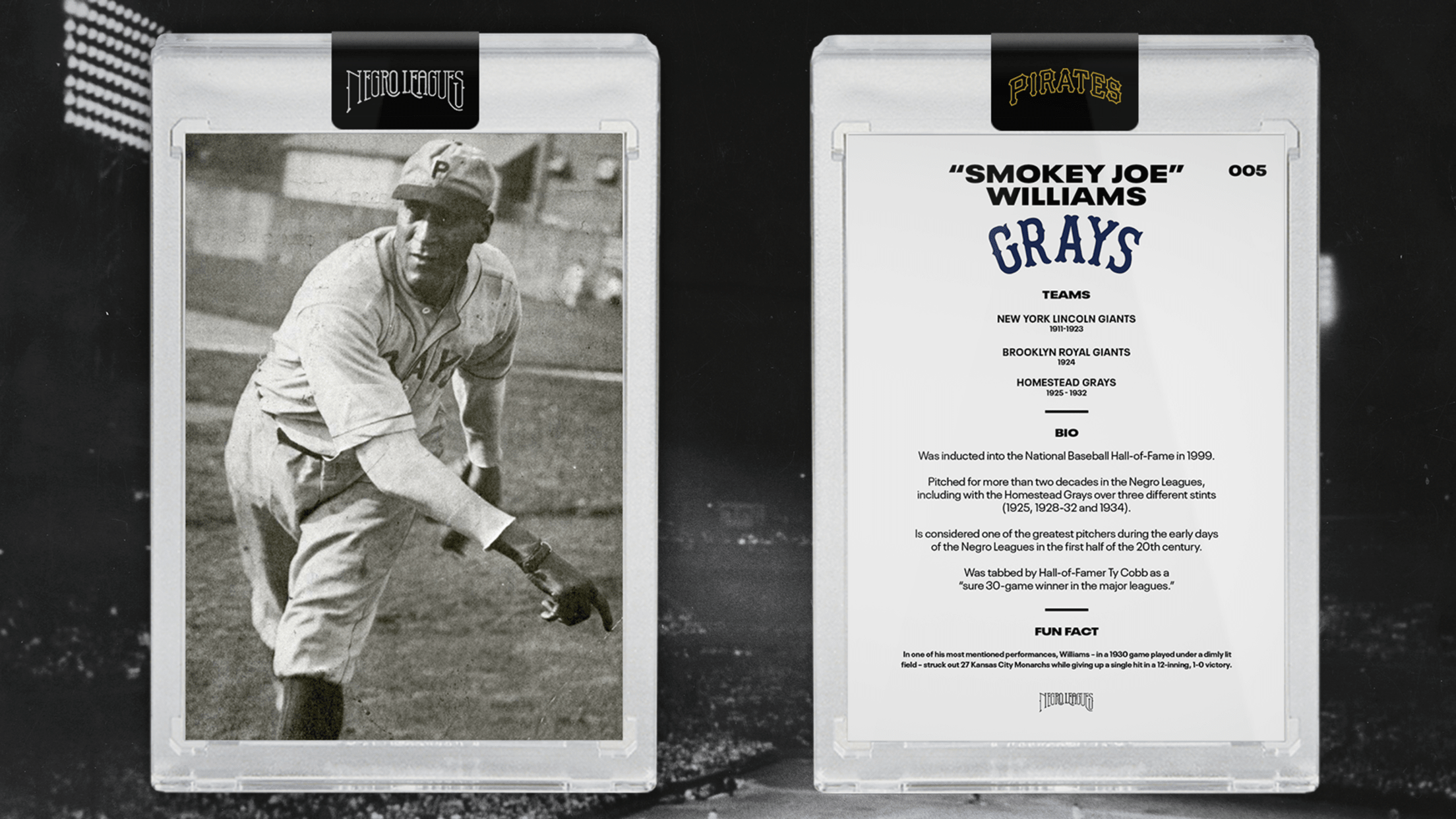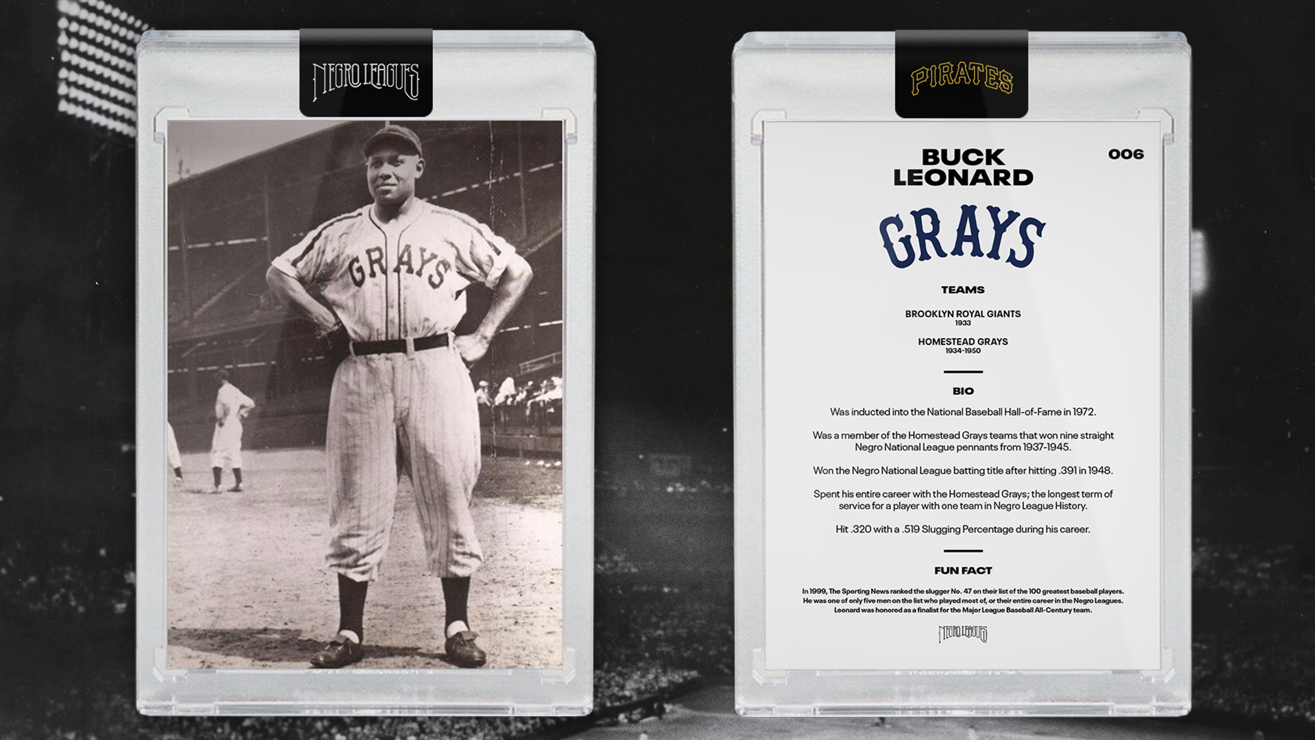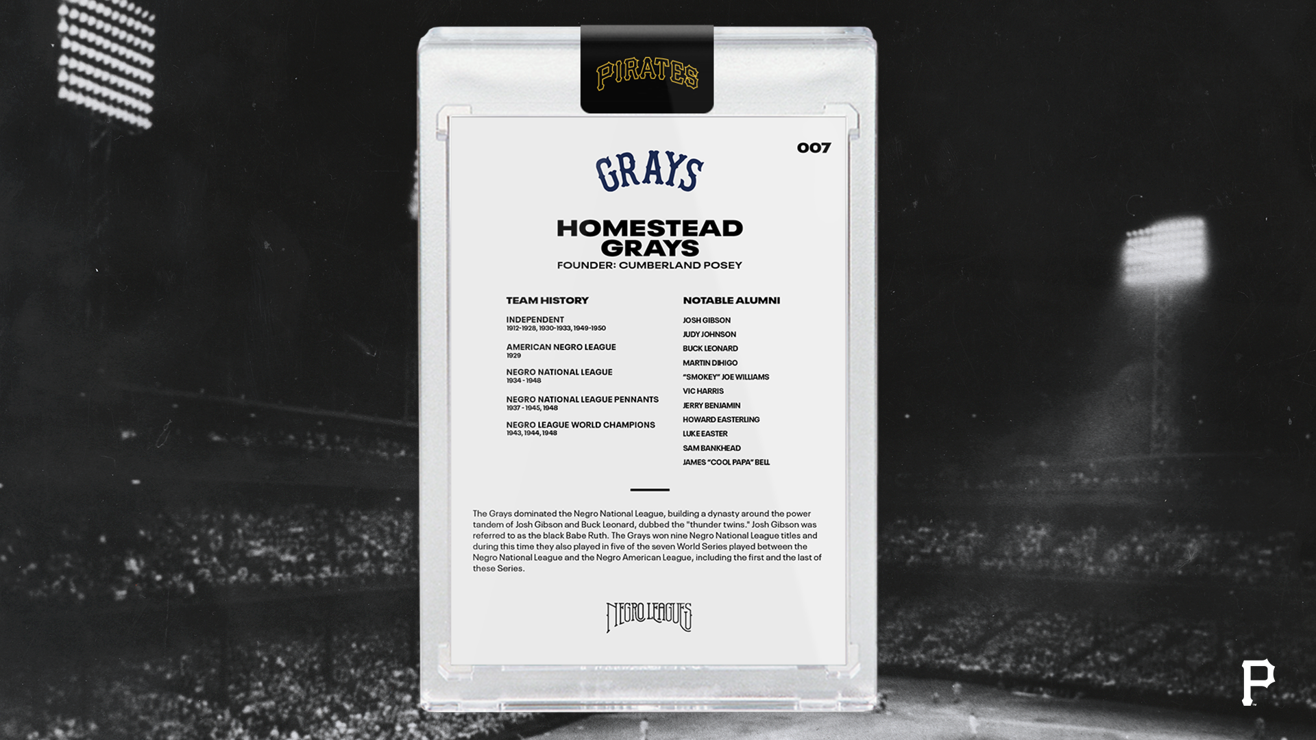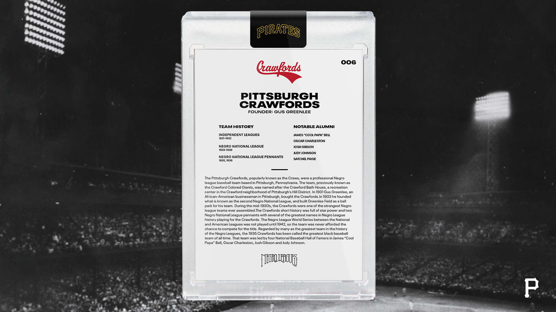 In honor of Black History Month, the Pirates are celebrating Pittsburgh's rich Negro League history. Pittsburgh was home to two of the most historic Negro League franchises: the Pittsburgh Crawfords and the Homestead Grays. Pittsburgh fielded an array of the game's top stars -- Josh Gibson, Leroy "Satchel" Paige, Buck Leonard and others -- unrivaled in the city's rich sporting past. The Pirates remain committed to educating and celebrating the legacy of the Negro Leagues with Pirates fans of all ages and backgrounds, not just during Black History Month, but all year long.