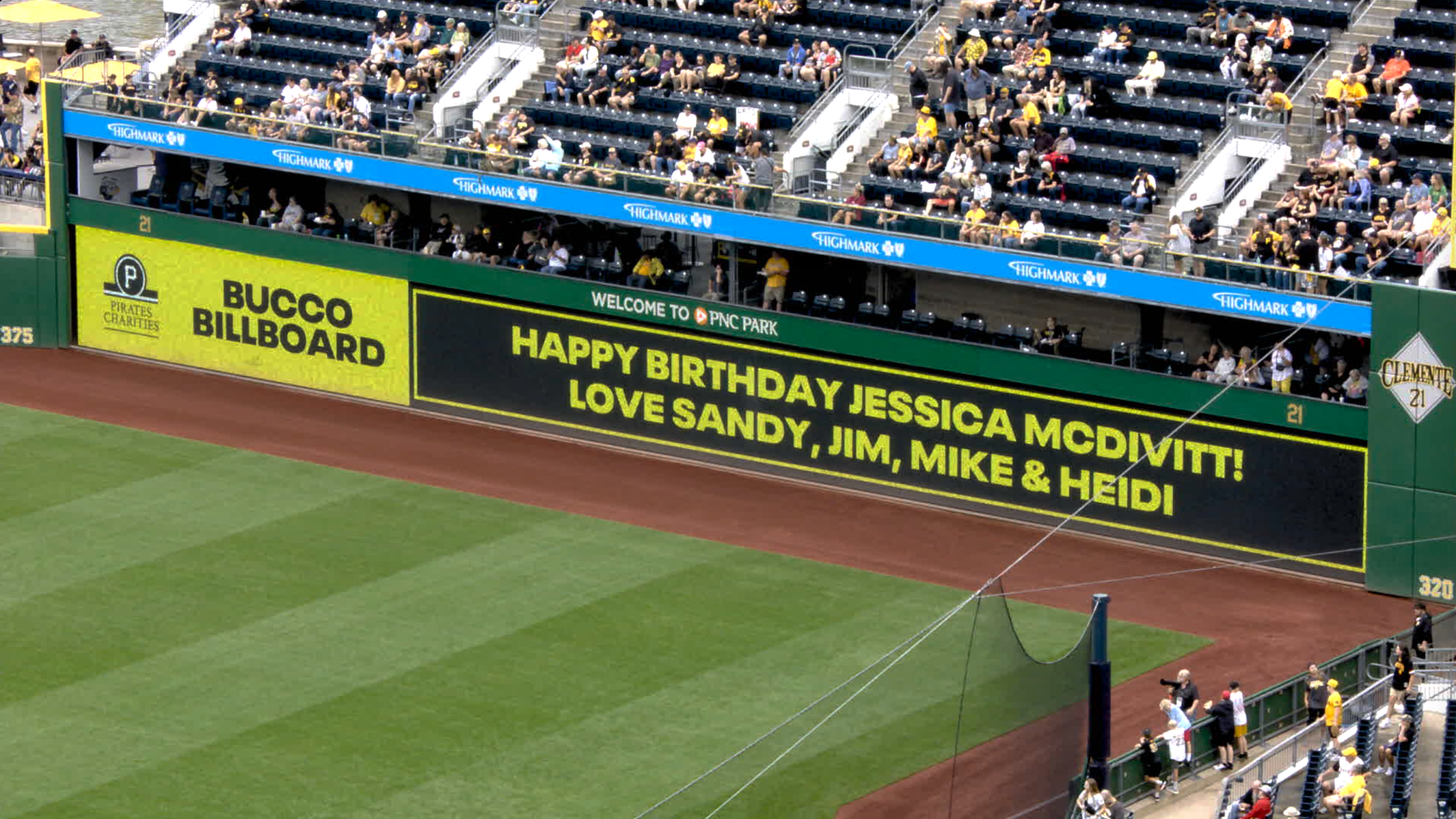 Commemorate a special occasion by displaying a message on the PNC Park scoreboard during a Pirates home game.