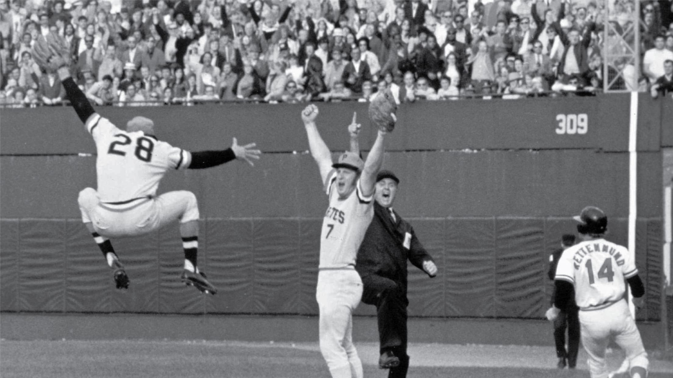 Pirates pitcher Steve Blass throws the final out as the Pirates defeat the Baltimore Orioles four games to three to win their fourth World Series championship.