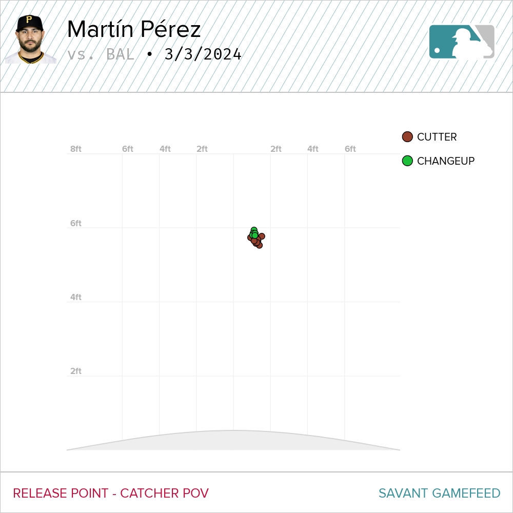 \n\n","providerName":"Twitter","providerUrl":"https://twitter.com","thumbnail_url":null,"type":"oembed","width":550,"contentType":"rich"},{"__typename":"Markdown","content":"The cutter and changeup make up about 50% of his pitch usage year to year. Executing those two offerings is what can make him a successful pitcher.\n\n“100%, because he's working to both sides of the plate,” manager Derek Shelton said. “He can cut the ball in on right-handers and then go changeup on the plate or off and start to strike the ball. That's really important. I don't know if he could have done it any better than he did it today.\"\n\nWhile it’s a small sample size, Pérez showed a much more consistent release point with those pitches Sunday. There will be fluctuation over the course of a season, but the range last year was noticeable:","type":"text"},{"__typename":"Image","caption":null,"contextualCaption":null,"contextualAspectRatio":"raw","credit":null,"contentType":null,"format":"jpg","templateUrl":"https://img.mlbstatic.com/mlb-images/image/upload/{formatInstructions}/mlb/cps9bvpqrh5qtz3ujgry","type":"image"},{"__typename":"Markdown","content":"On Sunday, the changeup came from almost the exact same spot each time, while the cutter was on roughly the same level:","type":"text"},{"__typename":"Image","caption":null,"contextualCaption":null,"contextualAspectRatio":"raw","credit":null,"contentType":null,"format":"jpg","templateUrl":"https://img.mlbstatic.com/mlb-images/image/upload/{formatInstructions}/mlb/xz6dtjywei6kwkuocvab","type":"image"},{"__typename":"Markdown","content":"“That’s what you’re looking for,” Pérez said about his release. “You’re trying to throw every pitch in the same tunnel and they’re gonna do the movement that you’re looking for. I think what we’re doing right now is the same, throw everything in the middle of the tunnel and it’s gonna move where you want it.”\n\nThe Pirates have had success recently with veteran pitchers in the same mold as Pérez. José Quintana and Tyler Anderson were also softer tossing lefties who found success by revamping their changeups with the Pirates. If Pérez can follow their lead, he could be a much-needed veteran arm for a young rotation with some question marks.","type":"text"},{"__typename":"Markdown","content":"Talking postgame, it is clear that Pérez is also approaching the game in a good spot mentally. Being demoted to the bullpen during a World Series run was tough, but with a firm spot in the rotation in place, he seems to have that 2022 approach to the game.\n\n“I was talking to \\[pitching coach\\] Oscar \\[Marin\\] during the game and I told him the confidence I have now is big,” Pérez said. “That’s one thing I was trying to get back, and I think I have it right now. When you feel that way, it means you’re gonna go out there and perform.”","type":"text"}],"relativeSiteUrl":"/news/martin-perez-improving-offspeed-pitches-for-2024","contentType":"news","subHeadline":null,"summary":"BRADENTON, Fla. -- It’s normal for Martín Pérez to rewatch his starts during the offseason. Well, at least some of his starts.\n\"I like to watch when I have good games,” Pérez said. “I don't like to watch bad games.”\nBy Pérez’s admission, most of the videos he watched this","tagline({\"formatString\":\"none\"})":null,"tags":[{"__typename":"InternalTag","slug":"storytype-article","title":"Article","type":"article"},{"__typename":"TaxonomyTag","slug":"apple-news","title":"Apple News","type":"taxonomy"},{"__typename":"TaxonomyTag","slug":"spring-training","title":"Spring Training","type":"taxonomy"},{"__typename":"TeamTag","slug":"teamid-134","type":"team","title":"Pittsburgh Pirates","team":{"__ref":"Team:134"}},{"__typename":"PersonTag","slug":"playerid-527048","title":"Martín Pérez","person":{"__ref":"Person:527048"},"type":"player"},{"__typename":"ContributorTag","slug":"alex-stumpf","title":"Alex Stumpf","type":"contributor"},{"__typename":"GameTag","gamePk":748134,"slug":"gamepk-748134","title":"2024/03/03 BAL@PIT","type":"game"}],"type":"story","thumbnail":"https://img.mlbstatic.com/mlb-images/image/upload/{formatInstructions}/mlb/xzuwnmyexzf6iyiro5jv","title":"Martín Pérez improving offspeed pitches for 2024"},"getTeamsBySportId({\"ids\":[1]})":[{"__ref":"Team:133"},{"__ref":"Team:134"},{"__ref":"Team:135"},{"__ref":"Team:136"},{"__ref":"Team:137"},{"__ref":"Team:138"},{"__ref":"Team:139"},{"__ref":"Team:140"},{"__ref":"Team:141"},{"__ref":"Team:142"},{"__ref":"Team:143"},{"__ref":"Team:144"},{"__ref":"Team:145"},{"__ref":"Team:146"},{"__ref":"Team:147"},{"__ref":"Team:158"},{"__ref":"Team:108"},{"__ref":"Team:109"},{"__ref":"Team:110"},{"__ref":"Team:111"},{"__ref":"Team:112"},{"__ref":"Team:113"},{"__ref":"Team:114"},{"__ref":"Team:115"},{"__ref":"Team:116"},{"__ref":"Team:117"},{"__ref":"Team:118"},{"__ref":"Team:119"},{"__ref":"Team:120"},{"__ref":"Team:121"}],"getHeaderFromForgePath({\"contentSource\":\"MLB\",\"headerPath\":\"/_navs/header/pit/global-nav\",\"locale\":\"en-US\",\"paletteKey\":\"t134-base-palette\",\"propertiesKey\":\"t134-global-properties\"})":{"__typename":"Header","navigation":[{"__typename":"NavItem","customPropertiesString":"mobile:true;","icon":null,"linkTarget":null,"linkText":"Tickets","linkUrl":"/tickets","placement":"mobile","visible":null,"subNav":[{"__typename":"SubnavColumn","title":null,"navigation":[{"__typename":"NavItem","placement":null,"linkText":"2026 Spring Training","linkUrl":"/tickets/spring-training","linkTarget":null,"visible":"true","icon":null,"tooltip":null,"customPropertiesString":""},{"__typename":"NavItem","placement":null,"linkText":"Ticket Info Request","linkUrl":"/tickets/information-request","linkTarget":null,"visible":"false","icon":null,"tooltip":null,"customPropertiesString":null},{"__typename":"NavItem","placement":null,"linkText":"Single Game Tickets","linkUrl":"/tickets/single-game-tickets","linkTarget":"","visible":null,"icon":null,"to
