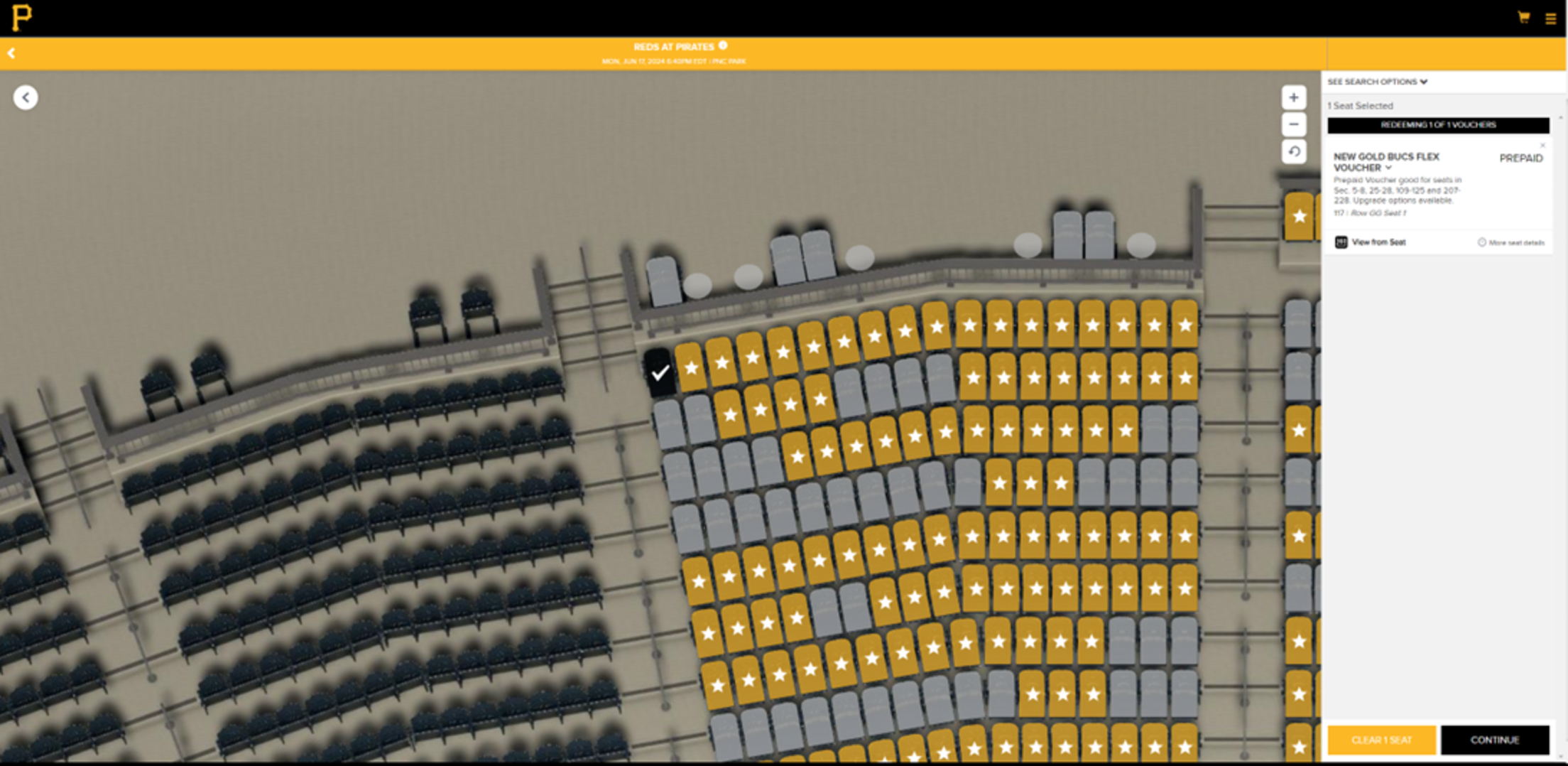 This will take you to the single game redemption flow, you can select seats by clicking section for best available, or seat map to pick your exact seats. Once you have selected you can pick one of the highlighted sections on the map and proceed with your transaction.