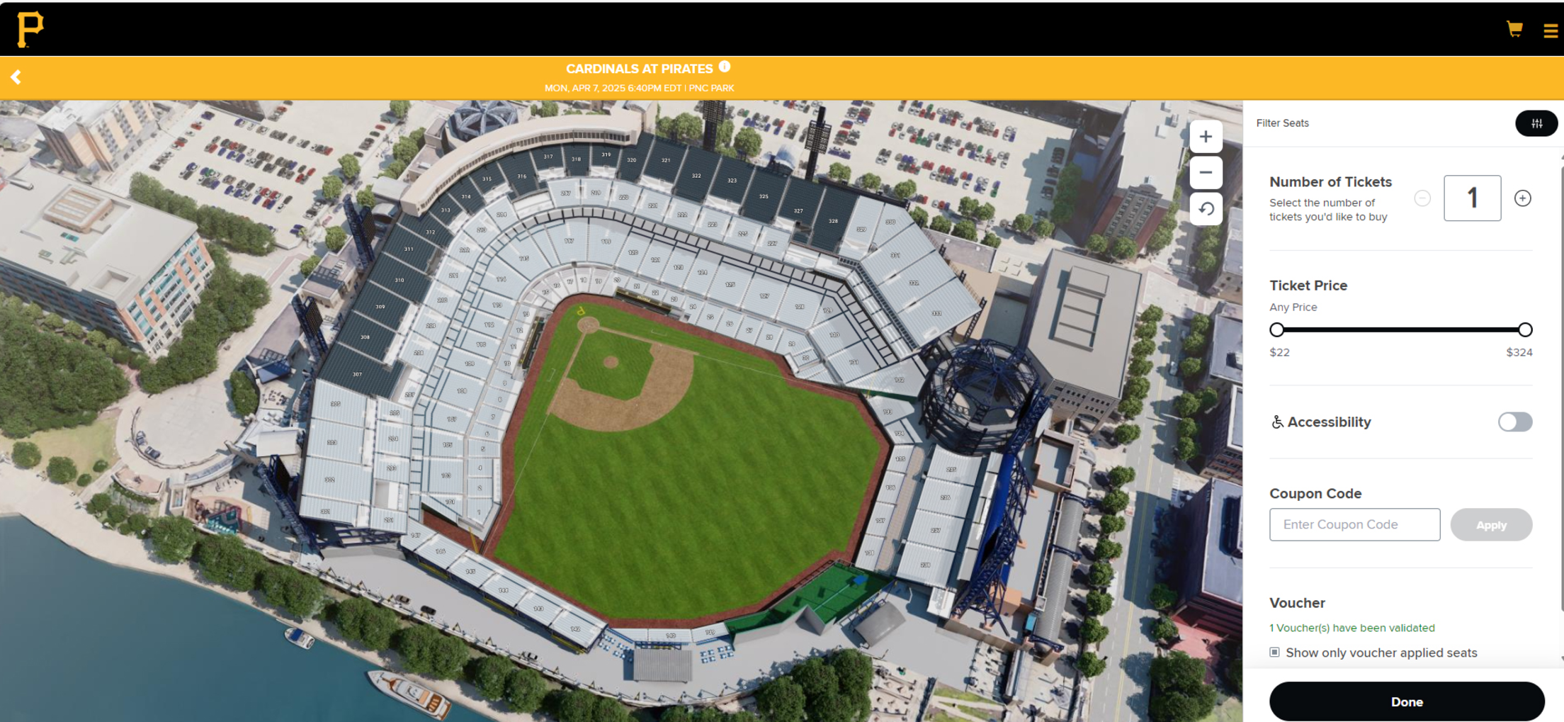 Once you select your game, please choose the number of seats you are looking for and hit done in the bottom right corner.