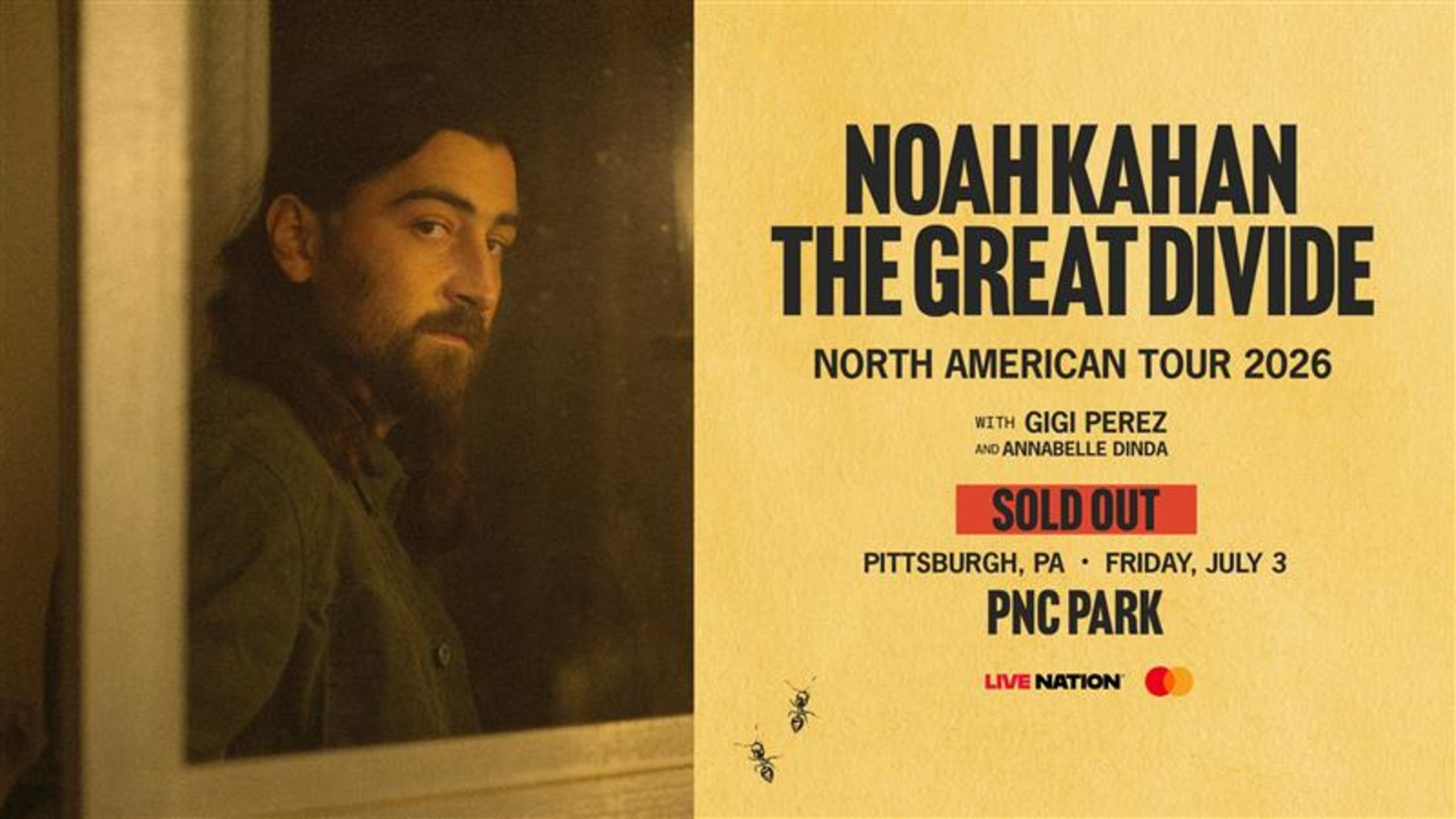 Grammy®-nominated, multi-platinum superstar Noah Kahan brings The Great Divide Tour to PNC Park on Friday, July 3, 2026, with special guests Gigi Perez and Annabelle Dinda.