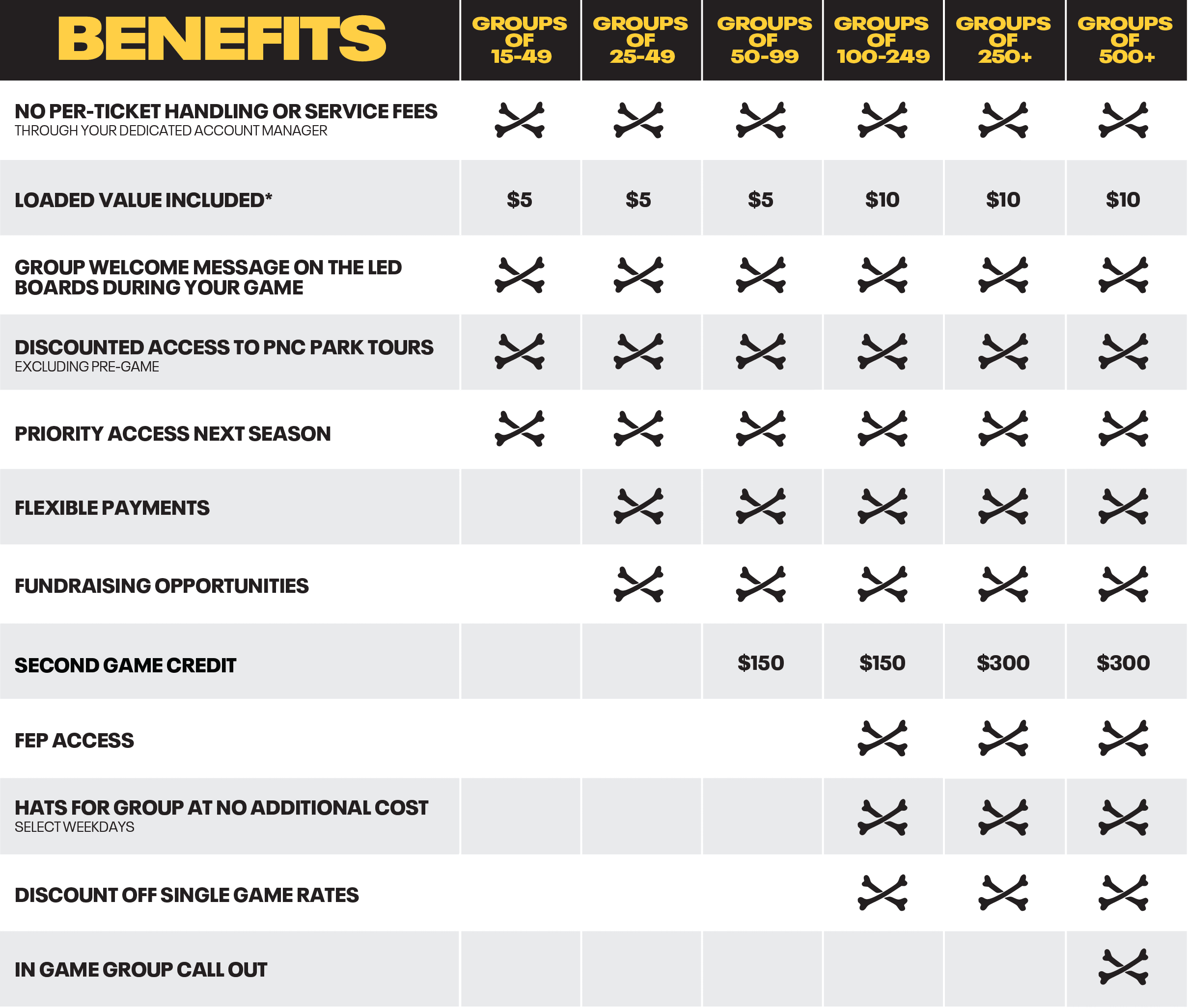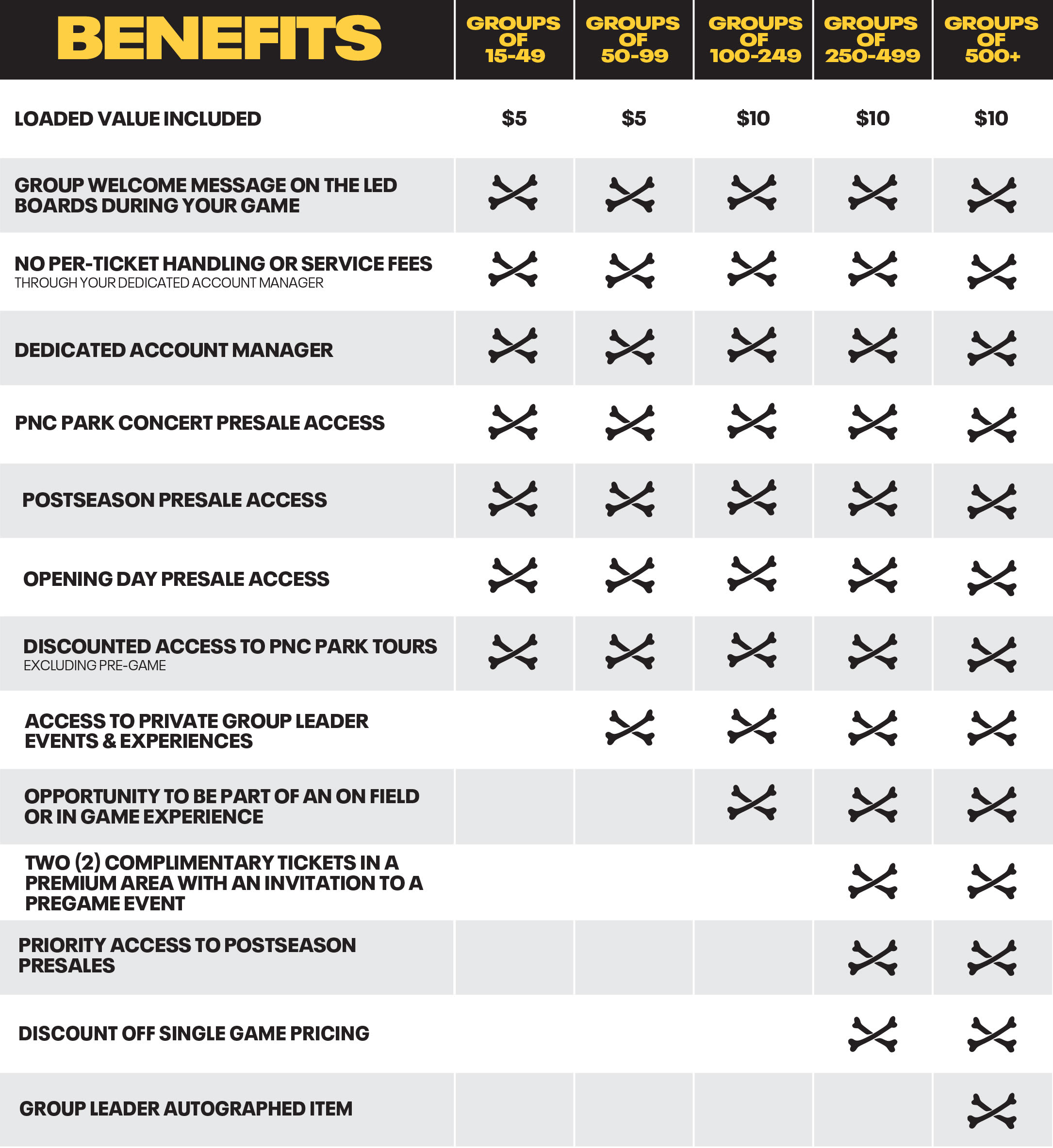 As a special thank you to Group Leaders for their hard work organizing their outing at PNC Park, we offer an extensive tiered benefit platform.