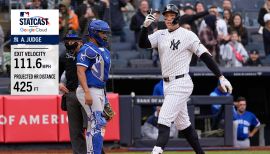 In 112 games with the Yankees (88 starts in RF, 19 at DH, 1 in CF), hit .278 (115-for-413) with 77R, 22 doubles, 27HR, 67RBI, 76BB and 6SB…the Yankees went 21-6 when he homered in 2018...Was a finalist for the AL Gold Glove Award in RF...Hit .352/.471/.699 (69-for-196) with 47R, 14 doubles, 18HR, 45RBI and 20 multi-hit games in 56 contests at Yankee Stadium…did not go consecutive home games without a hit over a 59-game stretch at Yankee Stadium (9/17/17-7/26/18)…hit safely in 17 consecutive home games from 9/17/17-4/16/18…had at least 1RBI in a franchise-record 14 straight home games from 9/18/17-4/7/18…was tied for the fourth-longest such streak in the Majors since RBI became an official statistic in 1920...Appeared in each of the Yankees' first 56 games of the season (3/29-6/4 G2)...Hit 25HR before the All-Star break, becoming the fourth player to hit at least 25HR before the break in two different seasons as a Yankee and just the second to do so in consecutive years, joining Roger Maris (1960-61), Mickey Mantle (1956 and '61) and Jason Giambi (2003 and '06)...Had a career-long 14-game hitting streak from 9/17/17-3/29/18…had an eight-game streak of drawing at least one walk from 9/24/17-3/29/18, matching the longest streak of his career...Made his first Major League start (and appearance) in CF in 3/31 loss at Toronto...Reached base safely in 23 of his 25 games in April (all except 4/27 and 4/29 at Los Angeles-AL), including each of his first 21 games of the month...Was 3-for-3 with an HR off Red Sox starter Chris Sale on 4/10…entered 0-for-12 with 10K in his career vs. Sale…became the first player to record 3H off Sale in one game since he joined the Red Sox before the 2017 season…prior to Judge, the last player with a three-hit game vs. Sale was Detroit's Miguel Cabrera, who went 4-for-4 with two solo HRs against Sale on 9/5/16 at Chicago-AL...Celebrated his 26th birthday on 4/26…his 63 career homers prior to turning 26 rank 13th in franchise history and are fifth-most in the last 50 years (Mattingly-94, Murcer-77, Jeter-70, Sánchez-71)...Had at least 1RBI in seven straight games from 5/6-13 (14RBI), tying the longest RBI streak of his career (also 7G: 9/24-30/17)...Hit game-winning two-run HR in the 13th on 6/6 at Toronto…was his first career extra-inning HR and was the latest Yankees HR to break a 0-0 tie since Alex Rodriguez's 15th-inning two-run "walk-off" HR on 8/7/09 vs. Boston...Hit game-winning solo HR in the eighth inning on 6/9 at the Mets…was the third straight game the Yankees hit a go-ahead HR in the eighth-inning-or-later, their first time doing so since 8/29-31/77 (three straight - Chambliss, Rivers and Nettles)…Judge hit two of those homers after having just one go-ahead HR in the eighth-inning or-later over his first 239 career games...Started in LF and went 1-for-2 with 1R, 1HR, 1RBI and 1BB in the AL's All-Star Game win on 7/17…his solo HR off Scherzer to lead off the second inning was the first of 10HR hit in the game and the first All-Star homer by a Yankee since Jason Giambi in 2003…became the third Yankee to homer in an All-Star Game at age 26-or-younger, joining Joe DiMaggio (1936) and Mickey Mantle (1955 and '56)…was selected by fans to his second straight AllStar team…is one of five position players drafted by the Yankees to make the All-Star team multiple times as a Yankee (also Thurman Munson, Don Mattingly, Derek Jeter and Jorge Posada)…received a fan-elected starting assignment for the second straight year and is the first Yankee to start at least two straight ASGs since Robinson Canó (2010-13) and first Yankees OF to start two straight since Curtis Granderson (2011-12)...Was 1-for-1 with 1R in 7/26 win vs. Kansas City before being removed from the game in the fourth for PH (Andújar) after being hit by a pitch in the first inning…underwent an MRI at NewYork-Presbyterian Hospital and was diagnosed with a chip fracture of the right wrist (ulnar styloid bone)…was placed on the 10-day disabled list with the injury from 7/27-9/14 (missed 45 team games)…in a simulated game at Yankee Stadium on 9/17, had 11 live at-bats off of RHP A.J. Cole, RHP Chance Adams and minor-league LHP Phillip Diehl...Hit the Yankees' 264th home run of the season with a solo HR in the eighth inning of 9/28 win at Boston, tying the single-season Major League record (1997 Seattle Mariners)…was his first HR since 7/21 vs. the Mets, snapping a 15-game homerless stretch (49AB) and 11-game stretch without a homer since returning from the D.L...Hit .421/.500/.947 (8-for-19) with 6R, 1 double, 3HR, 4RBI and 3BB in five postseason games…homered in each of the first 3G, joining Hank Bauer (1958 World Series Games 1-3) as the only Yankees to homer in each of the team's first three postseason games in a year (note: Johnny Mize homered in 1952 World Series Games 3-5 after missing the first 2G of the Series)…became the third player to begin a postseason with 3G with at least 2H and 1HR, joining St. Louis' Matt Carpenter in 2014 and the Yankees' Hank Bauer in 1958...Hit a two-run HR in the first inning of the Wild Card Game…with an exit velocity of 116.1 mph, was briefly the hardest-hit postseason HR of the Statcast era (since 2015), until Stanton's HR surpassed it later in the game...Set a postseason career high in hits in ALDS Game 1 at Boston, going 3-for-5 with a ninth-inning solo HR.