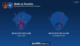 Began the season on the 15-day injured list from 3/27-4/17 with right elbow inflammation...Made a rehab start with Triple-A Worcester on 4/11 vs. Columbus and allowed one run in 6.0 IP (4 H, 4 SO, HB)...In his season debut on 4/17 vs. LAA (Patriots Day), allowed five runs in 2.2 IP (8 H, BB, 5 SO, HB)...Optioned to Worcester on 4/24, but did not pitch for the WooSox before he was recalled on 4/28...Posted a 2.45 ERA (16 ER/58.2 IP) over 10 starts from 4/29-6/23...Prior to that span, the most recent Red Sox to post a sub-2.50 ERA in a 10-start span prior to turning 25 were Jon Lester, Aaron Sele, Roger Clemens and Dennis Eckersley...Won a career-high three consecutive starts from 5/4-17, allowing five ER in 16.0 IP during that span...Made three straight starts with more than 6.0 innings and only one run allowed from 6/18-29...Since the start of 2020, the only other pitchers to do so at age 24 or younger are Spencer Strider (8/12-25/2023) and Alek Manoah (8/27-9/7/2022)...Struck out eight batters in 7.0 innings on 6/18 at NYY-G2 (4 H, R, 3 BB), setting a career high that he would surpass on 9/15 at TOR (10 SO)...Took a no-hitter into the eighth inning on 6/29 vs. MIA...Allowed two hits in the eighth before exiting; one of the runners later scored (7.0 IP, 2 H, R, BB, 5 SO)...During June, posted a 2.14 ERA (8 ER/33.2 IP) in five starts...Prior to Bello, the last Red Sox under the age of 25 to allow 0 HR and post an ERA that low over a five-start span was Roger Clemens in 1986...Recorded a career-best seven consecutive quality starts from 6/5-7/14 (4-1, 2.51 ERA, 13 ER/46.2 IP)...Was the 1st Red Sox pitcher to do so prior to turning 25 since Eduardo Rodriguez in 2017 (also 7, 4/23-5/26/17)...Allowed three-plus runs in each of his first four starts after the All-Star break, from 7/14-8/1 (6.55 ERA), then allowed one or two runs in each of his next five starts from 8/7-29 (2.79 ERA)...Recorded his first career 10-strikeout game on 9/15 at TOR (6.0 IP, 4 H, 3 R, BB, 10 SO).