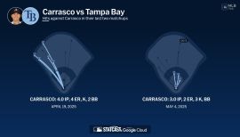 Enjoyed another solid season near the top of the club's rotation, but was limited to 25 starts due to injuries in April and September that ended his season two weeks early and forced him from his first postseason opportunity…At time of his last start on Sept. 17 vs. Detroit (2 pitches), he was 10th in the American League in ERA (3.32), 8th in strikeout/walk ratio (4.41) and on-base pct. allowed (.286) and 13th in batting average against (.240)…Was forced from his final start on Sept. 17 vs. Detroit after Ian Kinsler's line drive to lead off the game broke the fifth metacarpal on his right hand (shortest start of his career and shortest-ever by an Indian in the era of pitch counts-2)...Placed on 60-day D.L. on 9/30...Season got off to a nice start, going 2-0 with a 2.45 ERA in four April starts (22.0IP, 16H, 6R/ER, 5BB, 20K, .200avg) before sustaining a strained left hamstring covering first base in Detroit on April 24…Was placed on the 15-day disabled list the following day for the fifth time in his career and made one rehab start in Akron on May 28 before being activated 38 days later prior to his start vs. KC on June 2…Went 2-2 with a 2.61 ERA in June starts after returning (41.1IP, 36H, 12ER, 10BB, 43SO)...Tossed his seventh career complete game & third career complete game shut-out on June 25 at Detroit (9.0IP, 4H, 0R, 1BB, 7SO, 117P)…Recorded five-or-more strikeouts in 21 straight games from 6/13/15-4/19/16, the second-longest active streak in the majors at the time and the second-longest such streak in Indians history behind Bob Feller's record of 28 consecutive games (September 9, 1945-July 20, 1946)…Fanned a season-high 14 batters (2nd-highest game total of his career) on June 30 at Toronto, one shy of his career-high 15 punchouts on Sept. 25, 2015, at Kansas City… Marked just the third time since 1913 an Indians pitcher fanned 14 in less than 8.0IP or work (7.1IP, 3H, 1R/ER, 2BB), joining Corey Kluber (2014) and Sam McDowell (1966)...Earned the win on July 20 at Kansas City, holding the Royals scoreless on one hit and two walks with six strikeouts over 6.0 innings, marking the fourth time Carrasco has allowed one or fewer hits in an outing of 6.0 innings or more…Struck out 11 on Aug. 17 vs. Chicago-AL, his second-highest SO total of the season …marked his first career game with 10-or-more strikeouts and no walks, which he nearly matched on Sept. 2 vs. Miami (1BB, 11SO, 10th-career double digit strikeout game)… Earned his ninth win of the season on Aug. 22, shutting out Oakland on four hits over 8.0 innings with nine strikeouts and no walks…Despite that outing went 2-3 with a 5.20 ERA in 6 August starts (36.1IP, 42H, 21ER, 5BB, 46SO)…Was inflated by a 3.2IP, 8 R/ER (career-highs) outing vs. Minnesota on August 2...From August 7 to September 2, Carrasco struck out eight-or-more in six consecutive starts, tied with Clayton Kershaw for the longest streak in MLB this season…Batters hit .215 (42-195) with runners on base (9th-lowest in the A.L.) and .200 (20-100) with RISP… Walked only 2.1 batters per 9.0IP which was 11th-best in the A.L. at the time of his injury…Walked only 4 of 108 batters (3.7%) with runners in scoring position. (MLB Rank: 6th)…Did not allow a walk in his last 137 PA's against a RHH dating back to July 27 (longest active streak in MLB).