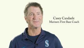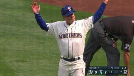 OAK@SEA: Mariners' first base coach hit by foul ball