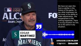 After raising his average 48 points in 1994 from 1993, raised it another 71 points in 1995. first healthy season in three years produced his second batting championship. his .356 average was the highest by a right-handed hitter in the AL in 56 years since Joe DiMaggio's .381 in 1939. finished third in AL MVP balloting behind Mo Vaughn and Albert Belle. named 1995 Outstanding Designated Hitter of the Year by the AL, and named Latino Sports 1995 Latino MVP. also led the league in on-base percentage (.479) and tied for the lead in runs and doubles. was second in hits and walks. became just the seventh right-handed hitter to win at least two batting titles, and the first in the AL in 52 years since Luke Appling (1936 & 1943). set new club marks in batting average, runs, doubles and walks. the 52 doubles tied for the 22nd most in history and was the fourth highest total in the ML over the previous 41 years. hit a career-high 29 HRs. average reached a season-low .333 on May 22 in game #23. hit his second career grand slam on June 7 at Baltimore off Armando Benitez. was named AL Player of the Month for June for hitting .402 with a ML-high 32 RBI in 28 games. was selected to his second All-Star Game and was the AL's starting designated hitter. set a club record with an RBI in nine consecutive games Aug. 12-20 (15 RBI total). along with Mike Blowers, set a club mark for RBI in a month with 33 in August (had previously set the mark with 32 in June). his longest hitless streak was eight at-bats. started every game of the season and reached base safely via hit or walk in 137 of 145. collected walk #100 on Aug. 27 which made him the first Latin player in history to walk 100 times. he led all ML hitters with a .433 average (55x127) against lefties; the third-highest average against LHPs in the Majors since 1975, behind Jeff Bagwell (.457 in 1994) and Rennie Stennett (.435 in 1977). batted .384 (53x138) with MISP. scorched the Yankees in the Division Series. hit .571 (12x21) in five games. became first player in history to drive in seven runs during a single post-season game in Seattle's come-from-behind win in Game 4. slugged a three-run HR in the third inning to slice Yankees lead to 5-3, then drilled a grand slam to center off John Wetteland in the eighth inning to give Seattle a 10-6 lead. was 3x6 in Game 5, including doubling home the tying and winning runs in the 11th inning off Jack McDowell to send Seattle to the ALCS. named to The Associated Press and The Sporting News All-Star teams. named "best hitter" in Baseball America's annual Tools of the Trade ranking. was one of six players to play in every game in 1995. played winter ball for San Juan in the Puerto Rican League.