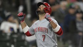 During the regular season led the Reds in HR and RBI...In September, led the Reds in total bases (44), HR (7) and RBI (19) in the push for their first Postseason appearance since 2013...Led the team in starts batting cleanup with 45...also made 10 starts batting third and two starts batting fifth...In Game 1 of the doubleheader on 8/2 at Det batted cleanup to snap at 100 his streak of consecutive starts batting third in the order (5/31/19 - 7/31/20)...In the 6-2 win on 9/5 at Pit became the 30th batter in Reds history to hit at least three HR in a game, accomplished for the 38th time and for the first time since Aristides Aquino did it on 8/10/19 vs Cubs...became the 10th Major League player from Venezuela to do it, the first since Det's Victor Martinez on 6/16/2016 at KC... produced a career-high five RBI for the third time and scored a career-high three runs for the 11th time...In the 5-0 win on 8/19/g2 at KC hit the 150th HR of his career (solo off Matt Harvey)...the ball remains nestled at the bottom of the Kauffman Stadium fountain...In the 7-1 win vs the Tigers on Opening Day made his 800th career appearance...Began the season 0-for-16 before he doubled off Kyle Ryan in the eighth inning on 7/28 vs Cubs...On 9/18 returned from the 3-day paternity list (daughter, Melanie Salomé)...in his absence, the Reds won both games vs the Pirates while Mike Moustakas played 3B...Did not play in spring training while recovering from 1/28/20 surgery to remove loose cartilage in his right shoulder.