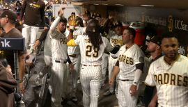 POSTSEASON: Played in all seven Padres' Postseason games between the Wild Card Series vs. ATL and the NLDS vs. LAD, batting .423 (11-for-26) with three doubles, four home runs, seven RBI, three walks and eight runs scored...had the highest average (.423), OBP (.500), SLG (1.000) and OPS (1.500) of any Padre in Postseason history with at least 30 plate appearances...In the NLDS alone, had an extra-base hit in four of the five games, batting .350 (7-for-20) with three doubles, three home runs, five RBI and six runs scored for a 1.359 OPS...his sole hitless game was in the decisive Game 5 of the NLDS at Dodger Stadium...with three home runs in the NLDS, finished one HR shy of the NLDS record: only Carlos Beltran (four in the 2004 NLDS with HOU) and Nick Castellanos (four in 2023 with PHI) had more...His 11 hits and four home runs in the Postseason led the Padres and were the most of any player on a club that failed to advance past the 2024 Division Series...Among all players in MLB Postseason history with at least 30 PA's, his 1.500 OPS in the 2024 playoffs was the fourth highest of any player in a single Postseason run, behind just Carlos Beltrán's 1.557 OPS in 2004, Barry Bonds' 1.559 OPS in 2002 and Manny Ramirez's 1.747 OPS in 2008...Has hit safely in 12 of his 13 career Postseason games...Between 2020 and 2024, his six HR and 12 RBI in that timeframe alone rank second all-time in Postseason franchise history, trailing only Manny Machado's seven HR and 13 RBI in the same timeframe...Seven of his 11 hits went for extra bases, tied with Manny Machado (also seven in 2022) for most extra-base hits by a Padre in a single Postseason in franchise history...Across his first five games in the 2024 playoffs, hit four HR without striking out once...the only other player in MLB history to have 4+ HR and zero SO over any five-game span in the Postseason was Lou Gehrig from 1928-32 (h/t @OptaStats)…Hit two home runs on Oct. 6 @ LAD in Game 2 of the NLDS, and it was his second-career Postseason multi-homer game (first was on Oct. 1, 2020 vs. STL)…he became the only Padre in club history to have two multi-homer Postseason games, and also became the first player in MLB history with two multi-homer Postseason games before turning 26...His double in Game 1 of the NLDS on Oct. 5 @ LAD was hit 118.9 mph off the bat, which marked the hardest hit ball of his career (regular or Postseason)…The 39 degree lunch angle on his home run in Game 1 of the Wild Card Series vs. ATL on Oct. 1 was his highest launch angle ever on a home run (regular or Postseason)…the home run was also the fourth anniversary of his first Postseason home run (hit two HR on Oct. 1, 2020 vs. STL at Petco in the Wild Card series vs St. Louis).