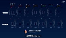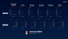 Jameson was 12-8 in 28 starts with a 3.27 ERA (60 ER/165.1 IP), 16 quality starts and 125 strikeouts in 2024...Among the Cubs starting rotation, his 165.1 IP and 16 quality starts are the second-most, while his strikeouts and ERA rank third (min. 10 starts)…Missed the beginning of the season with a back strain...Was activated from the injured list on April 18 and made his season debut on April 19 vs. Miami (1 ER/5.0 IP)…Made two rehab starts, one apiece with Double-A Tennessee and Triple-A Iowa, going 0-1 with a 4.26 ERA (3 ER/6.1 IP)…Was 8-4 with a 2.18 ERA (22 ER/90.2 IP) through 15 starts at home and 4-4 with a 4.58 ERA (38 ER/74.1 IP) in 13 starts on the road this season...His 2.18 ERA at home led all Cubs starting pitchers, was the second-lowest home ERA in the N.L. and fourth lowest in the Majors in 2024...Allowed one earned run or fewer in a career-best four-straight starts to begin his season...On April 29 at the Mets, became the first Major League pitcher to throw at least 7.1 innings in 78 or fewer pitches since Seattle's Logan Gilbert on May 25, 2023 vs. Oakland (8.0 IP, 77 pitches)…Marked the fewest pitches thrown by a Cub in an outing of at least 7.1 IP since Greg Maddux threw 73 pitches in 7.1 IP, on May 13, 2006 at San Diego...From June 11-July 23, posted a 2.47 ERA (14 ER/51.0 IP) and a 0.90 WHIP in eight starts...The 0.90 WHIP ranked second in the N.L. during the stretch, while the 2.47 ERA ranked sixth...Recorded his 1,000th career inning pitched on June 16 vs. St. Louis...Enjoyed a season-high, three-game winning streak from July 4-14...On Sept. 27, he made his 200th career Major League start (201 appearances) and tossed seven-scoreless innings for the 10th time in his career...Ended the season with back-to-back scoreless outings, the 13.0 consecutive scoreless-inning streak was his longest this year...In September, he pitched to a 0.84 ERA (3 ER/30.2 IP), made five-straight quality starts, and allowed two earned runs or fewer in each outing...His 0.84 ERA during the month was the second-lowest ERA in the Majors, behind Nick Martinez (0.83 ERA), while his 0.84 WHIP was the fourth-lowest in the N.L.
