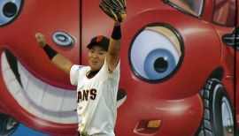 Was a non-roster invitee in San Francisco's major league training camp…spent most of season at Fresno (AAA), ranking among the Pacific Coast League leaders in batting (3rd, .329), on-base percentage (6th, .400), and stolen bases (T9th, 22)…was also 2nd on the Grizzlies in walks (42), 3rd in runs (54), and 4th in hits (113)…fanned just 36 times in 343 at bats…appeared in 55 games at 2B and 30 in LF…played exclusively at 2B through June 17 before moving to LF for remainder of season…had a .398 (35-88) average in his 1st 23 games through April 29, going 15-for-27 (.556) in the final 7 games of that span…hit safely in 7 straight games on 3 occasions with 4 hits on April 26 vs. Reno…batted .345 vs. RHP and .262 vs. LHP…had a .319 average in 33 games in the leadoff spot…connected for lone homer on Aug. 23 at Las Vegas…was batting .330 in 78 games for Fresno when purchased by San Francisco on July 9…went 1-for-4 in start in LF in major league debut that night vs. NYM, singling off Dillon Gee for 1st hit…hit safely in 1st 4 games at .400 (6-15) but went just 2-for-15 in final 11 games…appeared in 9 games in LF with 7 starts and had 6 chances without an error…hit .364 (4-11) on the road…was 0-for-4 as a pinch-hitter…was 5th native of Japan to play for the Giants…was optioned to Fresno on July 29 and designated for assignment and released on Sept. 3…played for Margarita in Venezuelan Winter League, batting .281 with 4 RBI in 9 games.