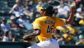 Began the season on the injured list with a knee injury, went 2-4 with a 5.17 ERA and .772 opponents OPS in eight starts with the A’s, and then finished the season on the IL with an elbow injury that led to “Tommy John” surgery...Struck out 32 batters in 40.0 innings but walked 20 for a strikeout-to-walk ratio of 1.60...Now has a 1.79 strikeout-to-walk ratio in his career (138 strikeouts, 77 walks, 149.2 innings)...Had five wild pitches and now has 16 in 149.2 career innings...Allowed a .276 opponents batting average, which broke down to .244 (20-for-82) with a .694 OPS against left-handed hitters compared to .311 (23-for-74) with an .859 OPS against right-handers...Yielded four home runs, three of which were solo shots...Was 1-1 with a 3.38 ERA and .664 opponents OPS in four starts during the day, 1-3 with a 7.23 ERA and .880 OPS in four starts at night...Was 0-3 with a 9.69 ERA in three starts on four days rest, 2-1 with a 3.00 ERA in his other five starts...Had no decisions and a 0.77 ERA in two interleague starts and was 2-4 with a 6.99 ERA in six starts against American League competition...Tossed six innings or fewer in each of his eight starts...Allowed one run four times and four runs or more four times.