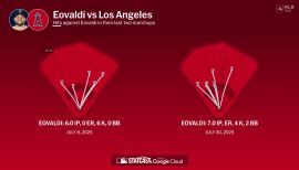 Was superb in 22 starts, going 11-3 with a 1.73 ERA (25 ER/130.0 IP), a 0.85 WHIP, a .194 opponent BA (90-for-463), and 129 strikeouts against 21 walks…campaign was interrupted by two stints on the Rangers’ Injured List – 5/29-6/26 (right posterior elbow inflammation) and 8/24-end of season (right rotator cuff strain) – which robbed him of qualifying status…Texas was 15-7 in his 22 outings, including winning each of his final nine starts from 7/2-8/22…among MLB pitchers with 130.0+ innings pitched in 2025, Eovaldi owned the lowest ERA, WHIP, and opponent on-base percentage (.239) while ranking highly in opponent OPS (second, .546), strikeout to walk ratio (second, 6.14), FIP (fifth, 2.71), and home runs per 9.0 figure (seventh, 0.69)…his 1.73 ERA was the lowest in franchise history (beg. 1961) by a Senators/Rangers pitcher through his first 22 starts of the year, ahead of Rick Honeycutt (2.32) in 1983…also was the second-lowest ERA in franchise history in a season of 130.0+ IP (1.57-Jim Kern in 1979, 143.0 IP in 71 relief appearances) and lowest by a Senators/Rangers starter… twirled a complete-game shutout on 4/1 at CIN (4 H, 0 BB, 8 SO, 99 pitches/70 strikes) in a 1-0 TEX win, the first complete-game shutout in MLB in 2025…was his second career nine-inning CG SHO, joining his three-hitter on 4/29/23 vs. NYY…first road CG SHO for TEX since Martín Pérez on 5/20/22 at HOU, first road CG SHO by a Rangers RHP since Kyle Gibson on 9/16/20 at HOU…first CG SHO by a Ranger within club’s first six games of a season since Rick Helling on 4/3/98 at TOR (Rangers’ third game of season)…earliest calendar date ever for a Rangers CG SHO (4/1)…fewest pitches in a CG SHO by a TEX pitcher since Colby Lewis on 9/11/15 vs. OAK (97)…went 5-0 with a 0.59 ERA (2 ER/30.2 IP) over five starts in July, posting the second-lowest monthly ERA for a Texas pitcher in club history (min. 30.0 IP) to only Yovani Gallardo’s 0.54 mark in June of 2015…capped month with his 100th career W on 7/30 at LAA (7.0 IP, 6 H, 1 R-ER)…was strong through his first four GS of Aug. (2-0, 2.67 ERA, QS with 7.0+ IP in three of four GS) but was placed on 15-day IL on 8/27 (retro to 8/24) with a right rotator cuff strain…experienced soreness following start on 8/22 vs. CLE (7.0 IP, 4 H, 1 R-ER, 0 BB, 9 SO), and imaging revealed strain… news was announced by Rangers President of Baseball Operations, Chris Young, on 8/26, with Eovaldi landing on IL the next day… allowed one-or-zero runs in seven consecutive starts, 4/25-5/27, the longest streak in franchise history (beg. 1961)…went 7-0, 1.56 (10 ER/57.2 IP) in his final nine GS from 7/2-8/22, marking the third longest win streak of his career: 9-0 in 13 GS from 6/20-8/30/15 with NYY, 8-0 in 10 GS from 4/18-6/10/23 with TEX…Rangers won his last nine starts of the year, longest streak of team wins by a single Texas pitcher since Cole Hamels in 2015 (TEX went 10-0 in 10 starts, 8/17-10/4/15)…boasted MLB’s third-lowest ERA in games following team loss (min. 10 GS): 6-2, 1.83 ERA (15 ER/73.2 IP) in 12 starts after a TEX defeat…was stingy against both RHB (.186/.230/.282/.512) and LHB (.202/.248/.329/.577)…had 2.15 ERA (14 ER/58.2 IP) in 11 home starts (eighth in MLB, min. 10 GS) and a 1.39 ERA (11 ER/71.1 IP) in 11 road outings (first in MLB, min. 10 GS)…his 1.39 ERA on the road was by far the best figure in WSH/TEX franchise history (min. 10 GS), surpassing Bert Blyleven’s 1.95 mark in 1977 (13 GS).