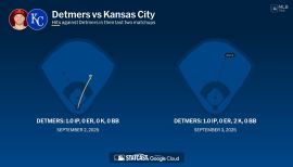Made Angels' Opening Day roster for first time in career and totaled 25 big league starts across two Major League stints...Entered year rated by Baseball America as top prospect in Angels' organization, the top left-handed pitching prospect in all of baseball and the #27 overall prospect in the game...Pitched 12th no-hitter in Angels' history (10th individual no-hitter), May 10 vs. Tampa Bay...Allowed just two baserunners (one walk & one reached on error)...Second Angels' rookie to throw a no-hitter, joining Bo Belinsky (May 5, 1962 vs. Baltimore)...At 22 years, 306 days, Detmers was the youngest MLB pitcher to throw a no-hitter since Anibal Sanchez (22 years, 191 days) for Marlins, Sept. 6, 2006...10th MLB pitcher all-time to throw a no-hitter within his first 11 career games...Only MLB pitcher with an individual no-hitter during 2022 season...Earned A.L. Pitcher of the Week honors for May 9-15...In 2nd inning, July 31 vs. Texas, pitched third immaculate inning in Angels' history after striking out Ezequiel Duran, Kole Calhoun and Charlie Culberson on nine pitches...Joined Nolan Ryan (July 9, 1972 vs. Boston) and Garrett Richards (June 4, 2014 at Houston) as only Halos pitchers to accomplish the feat...Also set a career high in that game with 12 strikeouts...Among A.L. rookies (min. 100 IP), ranked second in opponent batting average, third in ERA, strikeouts and WHIP (1.21) and tied for third in wins...Did not allow a home run in 17 of 25 starts...Held opponents homerless through final 39.0 innings of season and yielded just two HR in final 71.0 innings pitched...Made five starts in day games, going 3-1 with a 2.30 ERA (27.1 IP - 7 ER) and 28 strikeouts...Optioned to Triple-A Salt Lake June 22 and made one start for Bees, before returning to Angels' July 8 for remainder of season...Tallied 14 strikeouts in start for Bees, which matched Salt Lake franchise record; also Jered Weaver (2006) and Tyler Skaggs (2016)...Following return from Triple-A, pitched to a 3.04 ERA (71 IP - 24 ER) and 78 strikeouts in 13 starts.