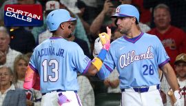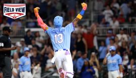 27-year-old Ronald Acuña Jr. played in his eighth Major League season (all with Atlanta), hitting .290 (98-for-338) in 95 games...Missed time due to two different stints on the injured list, first while recovering from left knee ACL reconstruction, then from a Grade 1 calf strain...Appeared in 89 games in right field and four as the designated hitter...Started in right and hit leadoff for Atlanta in his season debut, and drove the very first pitch he saw out to left for a home run...The ball left the bat at 115.5 mph and traveled an estimated 467 feet, the hardest-hit and farthest-hit ball by a Braves batter of the season (at that time)...Per StatsPerform, Acuña Jr. became the first player in MLB history to miss 150+ games and then hit a leadoff homer in his first game back...The drive was the 35th leadoff homer of his career, extending his own franchise record...Since the Braves moved to Atlanta in 1966, Acuña Jr. became just the third player in franchise history to carry an on-base percentage over .500 through their first 28 games (min. 100 plate appearances) of a season...Hall of Famer Henry Aaron (.500) was the first to do so in 1969, before Rico Carty (.504) joined him a year later in 1970...Made his season debut in the club’s 50th game, and went on to start in the All-Star Game...Per OptaStats, the only other player in MLB history to start the All-Star game despite not making his season debut until his team’s 50th game or later was Joe DiMaggio in 1949...Reached base five times on Aug. 27 without recording a hit, becoming one of just four Major Leaguers since 2020 to do so...Joey Bart (PIT) was the last to do so on August 1 earlier in 2025...Five Braves have done it in the franchise’s modern era, the last being Dale Murphy (5 BB, April 22, 1983)...On June 14, was named National League Player of the Week...Has now won the award five times in his career...On Sept. 8, snapped a 25-at-bat hitless spell, the longest of his career and the longest active in MLB at the time...From that date through the rest of the season, batted .362/.488/.638 (25-for-69) with 16 runs, six homers, 11 RBI and 16 walks...In that timeframe, had the best batting average and on-base percentage in the National League, as well as the most walks...Hit three more leadoff home runs in 2025, extending his franchise record to 37 of them...Carries a 16-game on-base streak into the offseason, tied for the fifth-longest active in Major League Baseball.