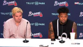 In 12 postseason games, hit .217/.333/.370 (10- for-46) with four doubles, one home run, three RBI, seven walks and 10 runs scored...His four doubles were the most by a Braves outfielder in a single postseason...Started Atlanta’s first six games in center field and the club’s final six games in right field. His only home run led off Game 1 of the Division Series, off Miami’s Sandy Alcantara…At 22 years, 293 days, became the youngest player in baseball history to hit a leadoff homer in a postseason game...It was the fourth such homer in Braves postseason history…Bill Bruton first did so in Game 2 of the 1958 World Series, and it was later matched by Marquis Grissom in Game 2 of the 1995 Division Series and Marcus Giles in Game 2 of the 2001 League Championship Series...Acuña Jr. was the first Atlanta player to step to the plate in the series…He is the 13th player in history to start a postseason series with a home run in the team’s first plate appearance…The last player to do so was Tampa Bay’s Yandy Díaz in the 2019 A.L. Wild Card Game...Went 6-for-15 (.400) with three extra-base hits (2 2B, 1 HR) in the first three games…Over the last nine contests, had just four hits in 31 at-bats (.129) with two extra-base hits, both doubles, and one RBI... Played through lingering left wrist soreness.