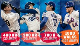 Slashed .310/.390/.646 in 159 games during his first season with the Dodgers, establishing career-high marks in each category…also set career-high marks in hits (197), doubles (38), home runs (54), RBI (130) and stolen bases (59)...On Sept. 19 in Miami, became the first player in Major League history to enter the 50/50 club…went 6-for-6 with three home runs, 10 RBI, two doubles and two stolen bases in the game, breaking the Dodger single-game RBI record held by Gil Hodges (9, 1950) and James Loney (9, 2006)...Entered the 40/40 club in dramatic fashion on Aug. 23 vs. the Tampa Bay Rays, slugging his first-ever career walk-off grand slam to become the fastest MLB player to enter the elite group (129 G)…achieved the 30/30 mark on July 30, becoming the third Dodger in franchise history to accomplish the feat (Raul Mondesi (1997, 1999) and Matt Kemp (2011))...On April 21, smacked his 176th career home run to become the home run leader amongst Japan born players… notched his 200th career home run on July 13 at Detroit...Ranked first in the National League in multiple categories, including: home runs (54), runs (134), RBI (130), OBP (.390), SLG (.646), OBP (1.036), plate appearances (731) and total bases (411)…ranked second in stolen bases (59) behind Elly De La Cruz...Was named the NL Player of the Month in September, after slashing .393/.458/.766/1.224 in 26 games with 10 home runs, 32 RBI and 16 stolen bases…was named NL Player of the Week four times throughout the season (May 5, June 23, Sept. 22, Sept. 29)...Earned his fourth All-Star distinction after averaging .316 in 94 games in the first half…batted a .400 OBP, .635 SLG, 1.035 OPS with 29 homers, 69 RBI, 23 stolen bases, and 75 runs scored...In his first career Postseason, won the World Series after swatting three home runs and 10 RBI through 16 games for a .230/.373/.393 slashline...Unanimously named the National League MVP, earning 30 of the 30 first-place votes, becoming the first Dodger designated hitter and ninth offensive player to win the award…became just the second player in MLB history to be named MVP in both leagues, joining Frank Robinson...Racked up the offseason accolades after being named to his fourth straight All-MLB First Team (2021-24) and Edgar Martinez Outstanding DH of the Year (2021-24), National League Silver Slugger Award (third career), National League Hank Aaron Award and MLB Players Choice NL Outstanding Player Award.