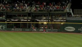 Tyler McDonough makes a crashing catch into the wall