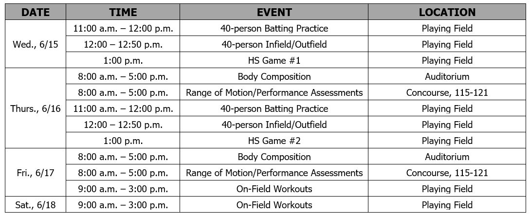 The Combine will provide an opportunity for players to participate in a series of medical and performance assessments as well as educational programming designed to prepare them for careers in professional baseball. All players will have the opportunity to participate in a pro-style showcase workout, as well as strength and performance assessments. Additionally, high school players will have the option to participate in games against other high school Combine attendees.