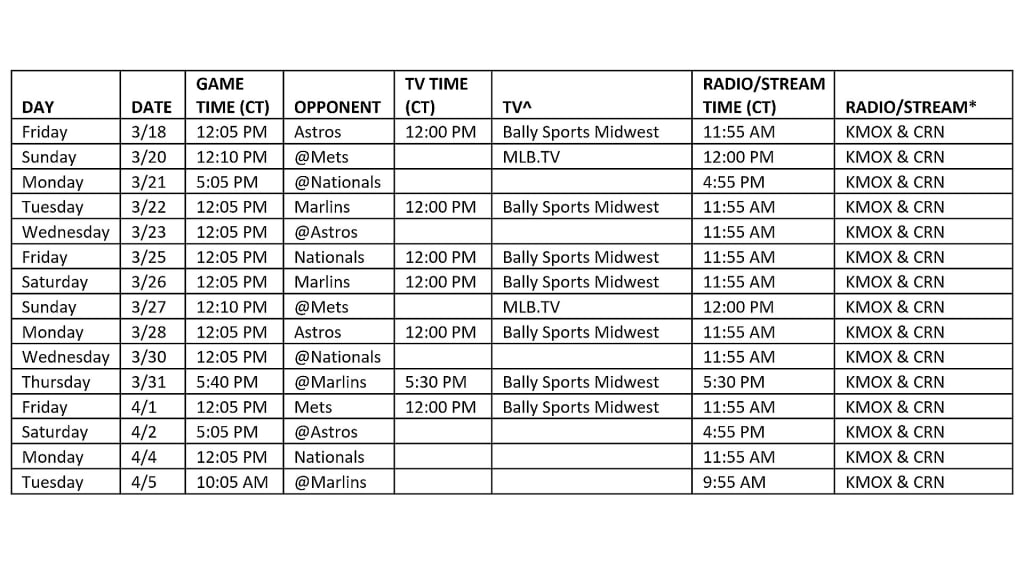 Additional Cardinals spring contests may be televised or broadcast by opposing teams and be available for streaming via the MLB app, MLB.TV, or cardinals.com.