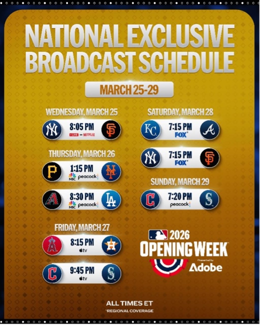 Major League Baseball will open the 2026 season with a full weekend of nationally televised matchups across its expanded roster of media partners, giving fans more ways than ever to watch the game’s biggest stars. Throughout MLB Opening Week presented by Adobe, MLB’s national partners will deliver a robust slate of games across television and streaming platforms. Fans can visit MLB.com/Watch for a complete schedule on where every game will air throughout the season.