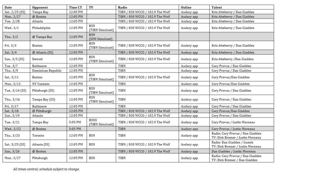 The complete Minnesota Twins 2023 Spring Training broadcast schedule follows.