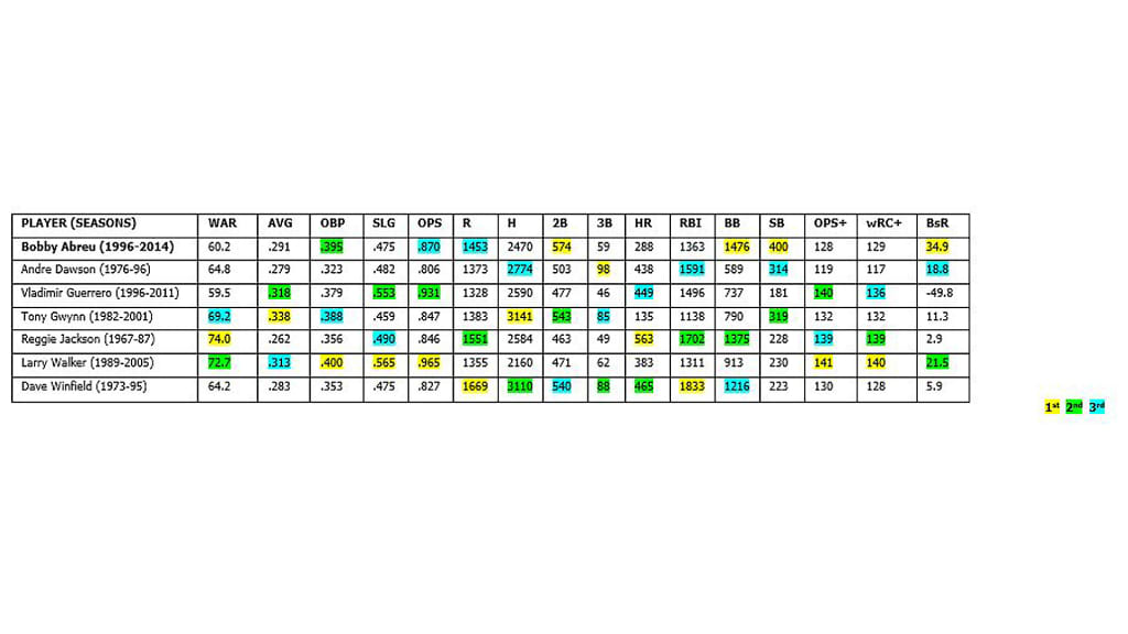 For 18 seasons, Abreu used an extremely unique and dynamic blend of discipline, power, speed and durability to cement himself as one of the game’s most productive and consistent players. During his 12 best seasons (1998-2009), Abreu played in more games than any other player (1,877). He was second to only Barry Bonds in walks (1,231) and Todd Helton in doubles (472), was tied for third in stolen bases (341), sixth in extra-base hits (779), seventh in hits (2,059), eighth in RBI (1,160) and WAR (57.3) and 11th in OBP (.406). During his true peak (1998-2005), Abreu’s WAR (45.2) was higher than Vladimir Guerrero (44.3), Chipper Jones (43.8), Derek Jeter (40.6), Ivan Rodriguez (37.4), Jeff Bagwell (36.8), Larry Walker (35.9) and every other Hall of Famer to play in that time frame. His career WAR of 60.2 is higher than 11 other Hall of Fame right fielders, including Guerrero (59.5), Enos Slaughter (57.0) and Chuck Klein (46.0).