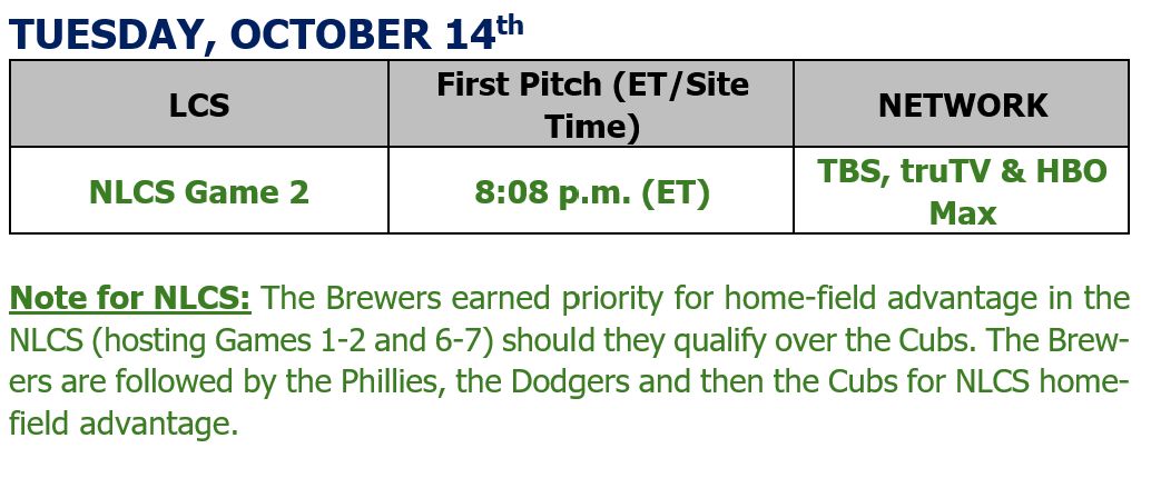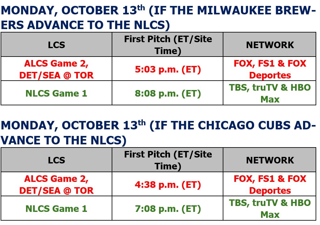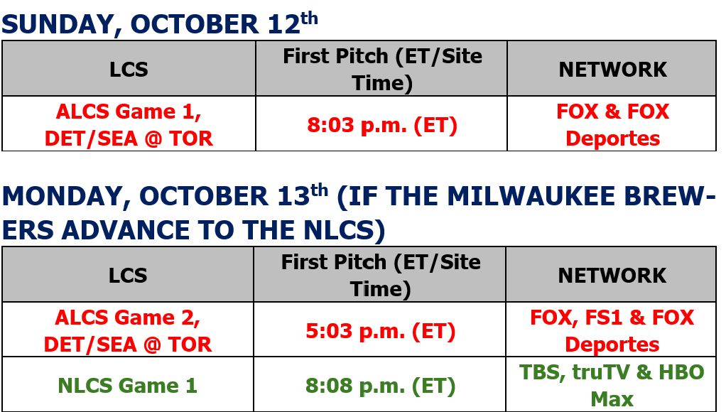 Major League Baseball today announced the broadcast schedule for the first three days of the 2025 League Championship Series Presented by loanDepot. The ALCS will feature the host Toronto Blue Jays playing either the Detroit Tigers or the Seattle Mariners, beginning Sunday on FOX. The NLCS will pit the winners of the NL Division Series – either the Milwaukee Brewers or the Chicago Cubs on one side facing either the Los Angeles Dodgers or the Philadelphia Phillies on the other side – beginning on Monday on TBS, truTV and HBO Max.