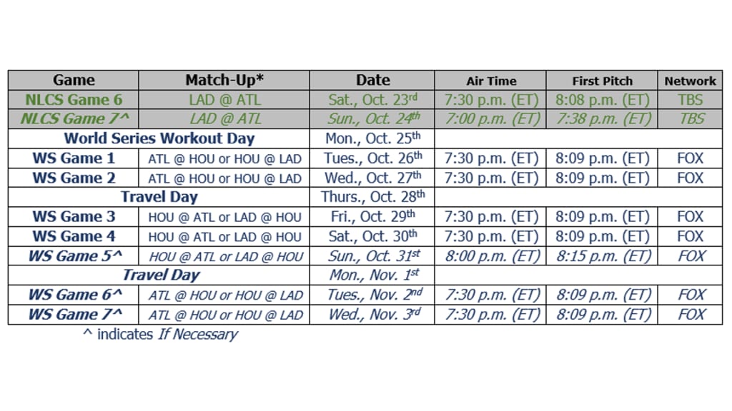The 2021 Postseason schedule can be viewed at MLB.com/postseason. All games exclusively covered by FOX and TBS will be available to MLB.TV subscribers who are authenticated subscribers to the applicable network through a participating pay TV provider. ESPN Radio will provide live national coverage of all games of the 2021 World Series. MLB Network will air extensive pregame and postgame coverage throughout the Fall Classic, plus produce the World Series broadcast for MLB International.