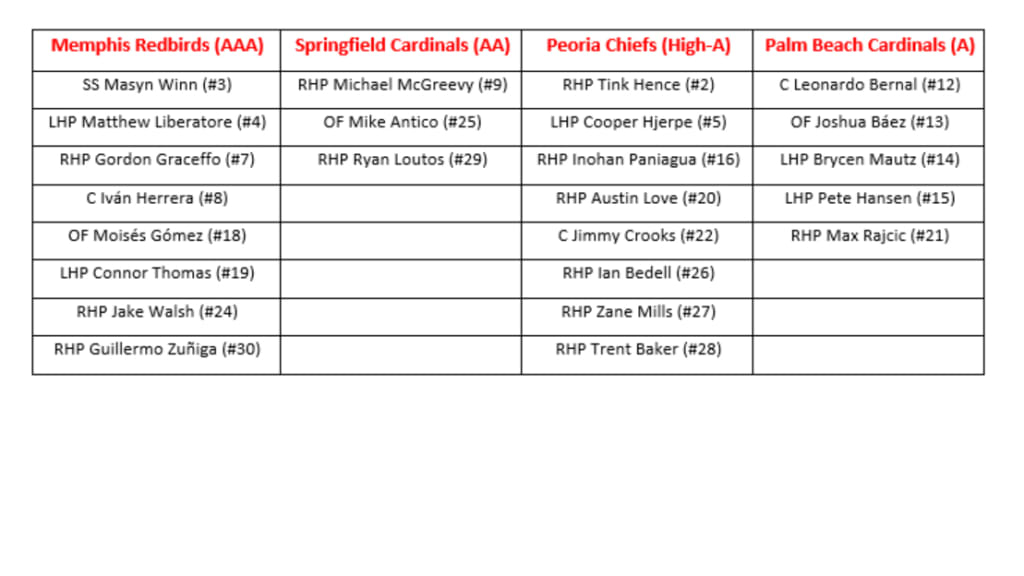 ST. LOUIS, Mo., April 5, 2023 – The St. Louis Cardinals have announced the 2023 Opening Day rosters for their Double-A, High-A and Single-A affiliates. All three affiliates will open the season on Thursday, April 6, at home with Springfield scheduled to take on Wichita at 6:35 PM CT, Peoria to host Cedar Rapids at 6:35 PM CT and Palm Beach to take on Jupiter at 5:30 PM CT. Additional roster moves may be made before Opening Day.