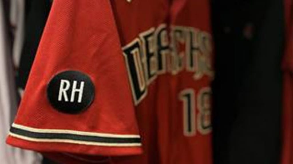 The Arizona Diamondbacks are honoring baseball legend Roland Hemond during Spring Training with a right-sleeve patch featuring his “RH” initials in white text on a black circle.