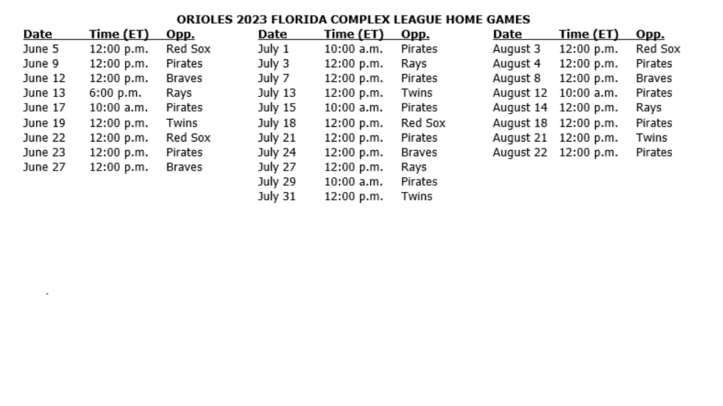 The Orioles’ year-round baseball operations continue in Sarasota, Fla. with the Florida Complex League (FCL) Orioles, who begin play on Monday, June 5, at Ed Smith Stadium. TheFCL O’s are scheduled to play 28 home games between June 5 and August 22, with potential playoffs from August 25-27. The FCL, which includes 16 teams, gives recently drafted or signed players their first experience in professional baseball.