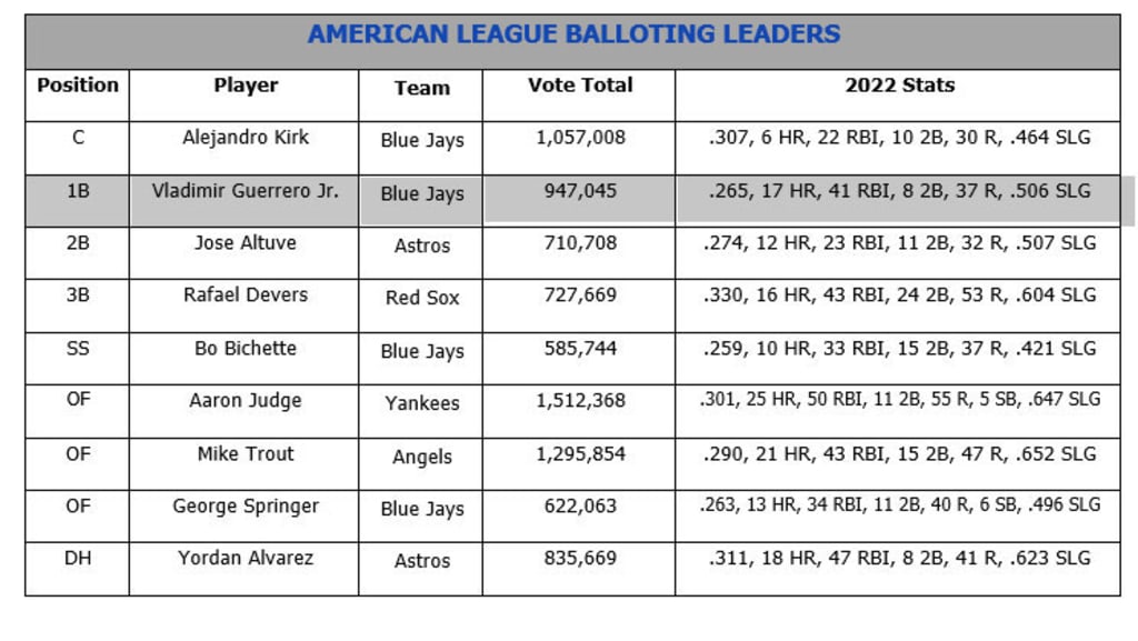 - Blue Jays first baseman Vladimir Guerrero Jr., who led all Major League players in fan voting a year ago, paces the AL first base race with 947,045 votes. Seattle Mariners first baseman Ty France (596,030) and Anthony Rizzo of the Yankees (445,683) are also contending for the right to advance behind Guerrero.