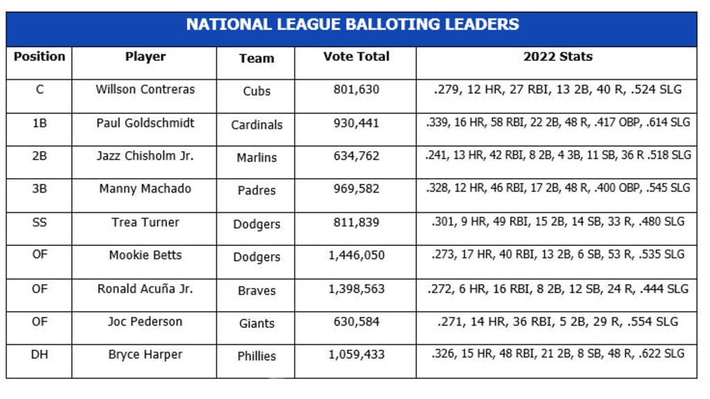 - Six-time All-Star Bryce Harper of the Philadelphia Phillies ranks third among all NL players with 1,059,433 votes. An elected starter five times previously, Harper is followed by William Contreras of the Braves (584,630) and Albert Pujols of the St. Louis Cardinals (344,248), a 10-time All-Star bidding for one more Midsummer Classic appearance in his legendary 22-year-career.