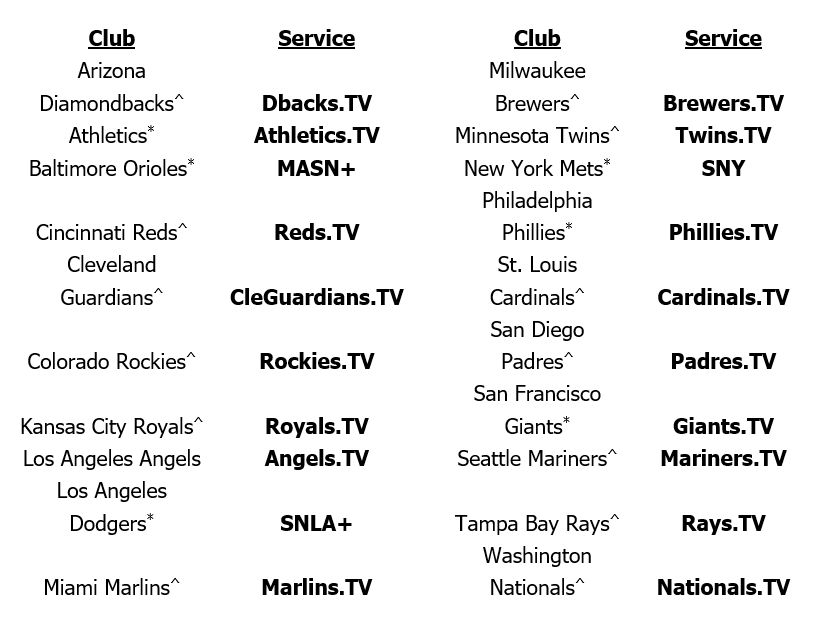 ^ Indicates the Clubs whose local games will be produced by MLB. When available, Spring Training games for these clubs will be free to stream for fans with a valid MLB.com account.