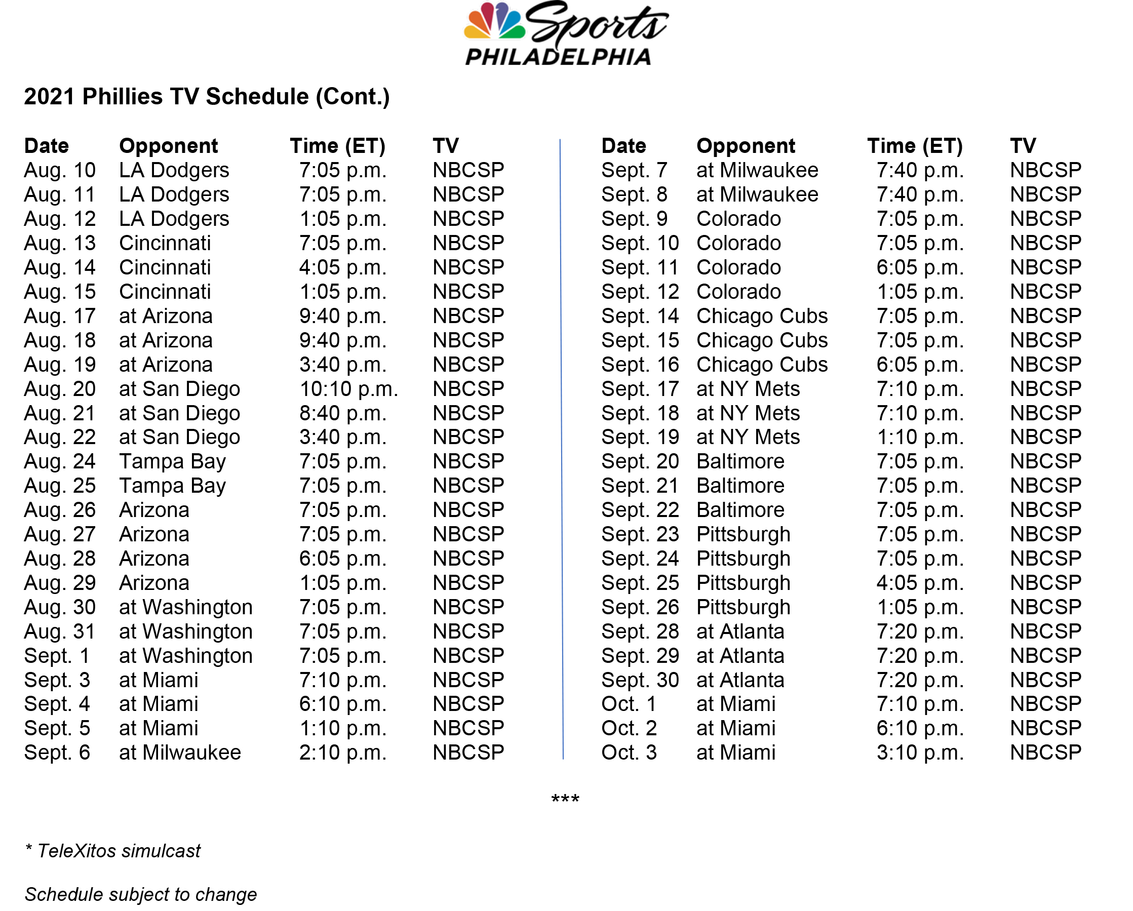 NBC Sports Philadelphia’s live Phillies coverage, including pregame and postgame shows, will continue to be available to stream live on the MyTeams app and NBCSportsPhiladelphia.com.
