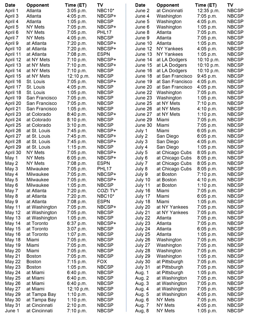 This season’s Phillies live-game schedule features 136 games on NBC Sports Philadelphia, 17 games on NBC Sports Philadelphia Plus, two games on NBC10 (WCAU) – including Opening Day on April 1 – two games on PHL17 (WPHL) and one game on Cozi TV. In addition, three games will be simulcast with Spanish commentary on multicast network TeleXitos. The television schedule is subject to change.
