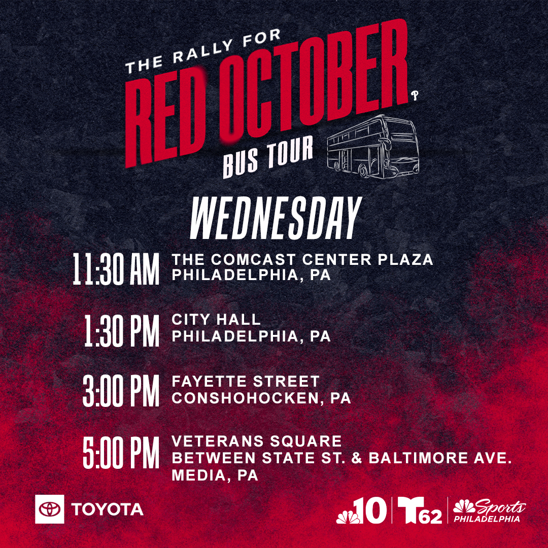 - Join the Phillies, NBC Sports Philadelphia, NBC10 and Telemundo62 for lots of postseason fun as the Rally for Red October Bus Tour presented by your local tri-state Toyota dealers makes appearances throughout the area.